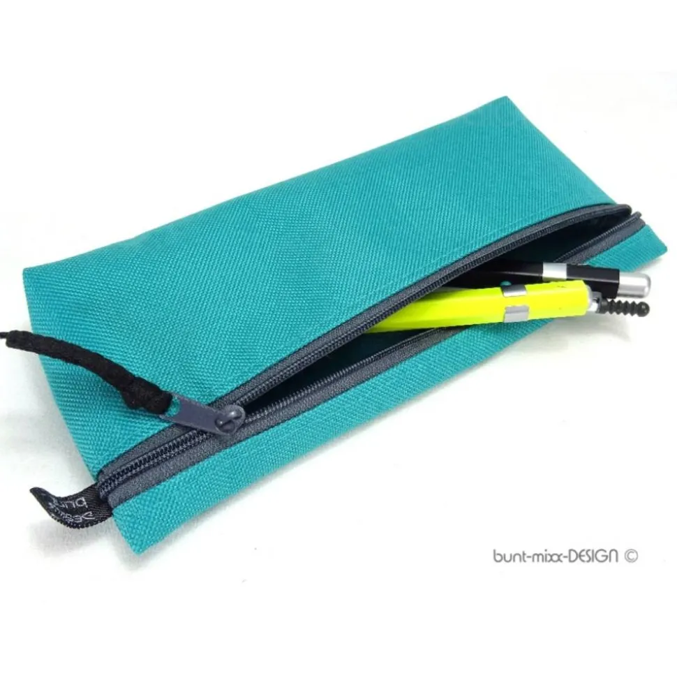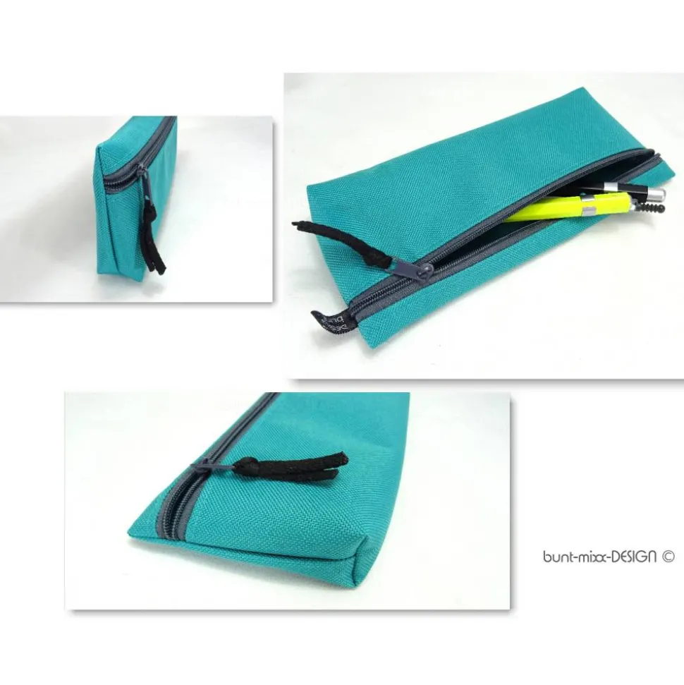 Das Täschchen in petrol hat den Zipper in grau, bei allen andere ist der Reißverschluß schwarz.