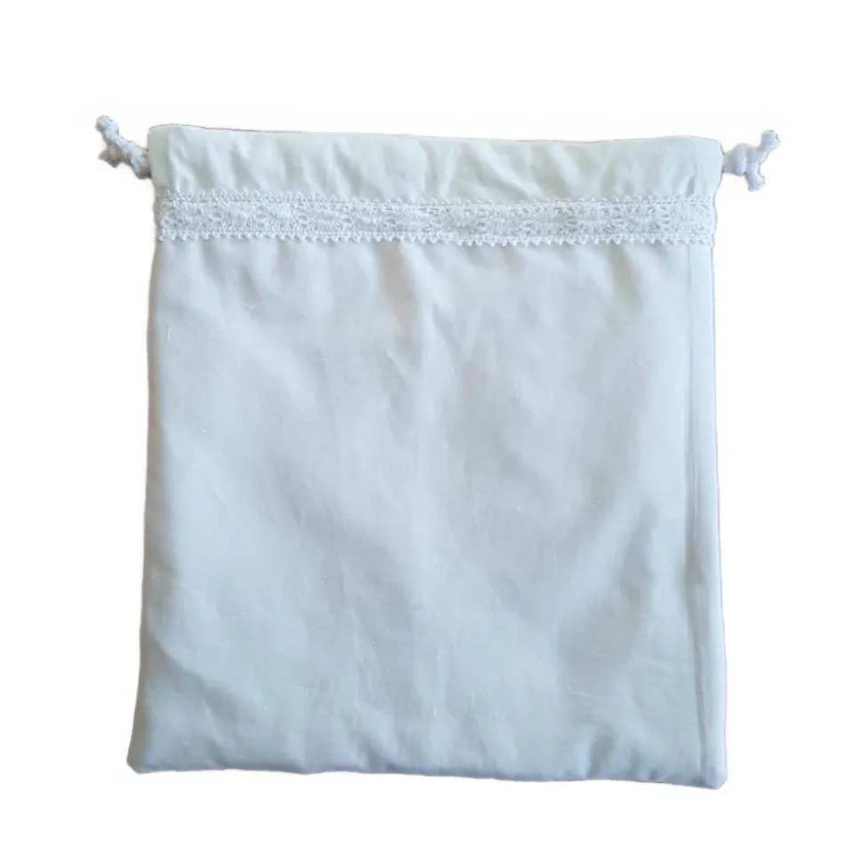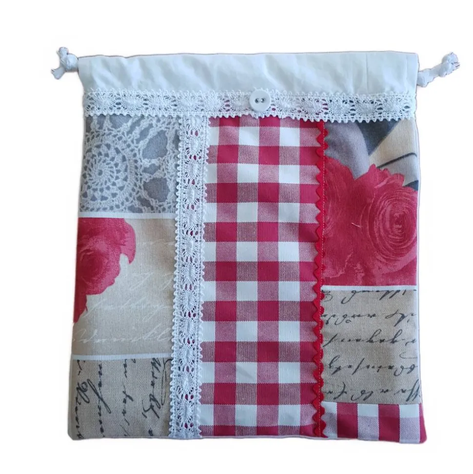 Der praktische Stoffbeutel ist aus verschiedenen Stoffen in liebevoller Patchworkart gefertigt und mit einer weißen Baumwollborde verziert. In der Mitte ziert ein weißer Wäscheknopf den Beutel, der mit einer weißen Baumwollkordel verschlossen wird. Der Innenbeutel besteht ebenfalls aus weißem Baumwollstoff.