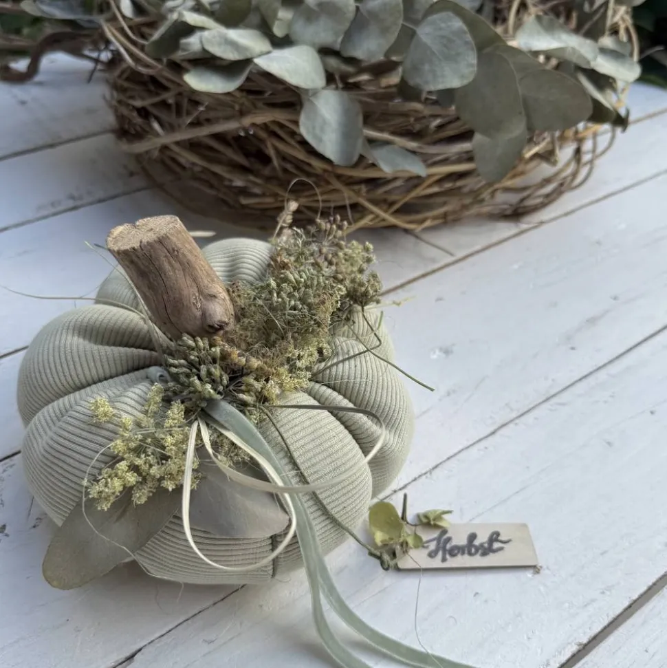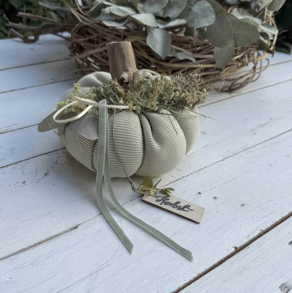 Entdecke deinen einzigartigen Stoffkürbis im XL-Format – handgefertigt aus 100% feingerippter, weicher und blickdichter Baumwolle in hellem Farmgrün mit sanften Pastell Farbtönen. Setze wunderschöne Naturakzente mit Details aus echtem Treibholz, Seegras, luftgetrockneten Wildblumen und Curry Moos aus norwegischen Wäldern. Perfekt als herbstliche Tischdekoration im Skandi Look für ein gemütliches, zeitloses Wohnambiente.