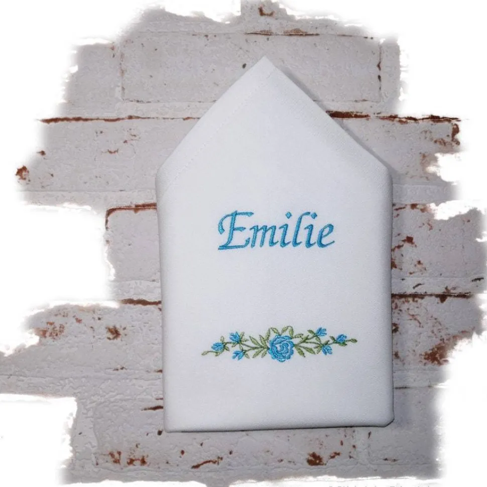 Das zusätzlich aufgestickte Blumenmotiv hat die gleiche Garnfarbe wie der Name des Gastes!