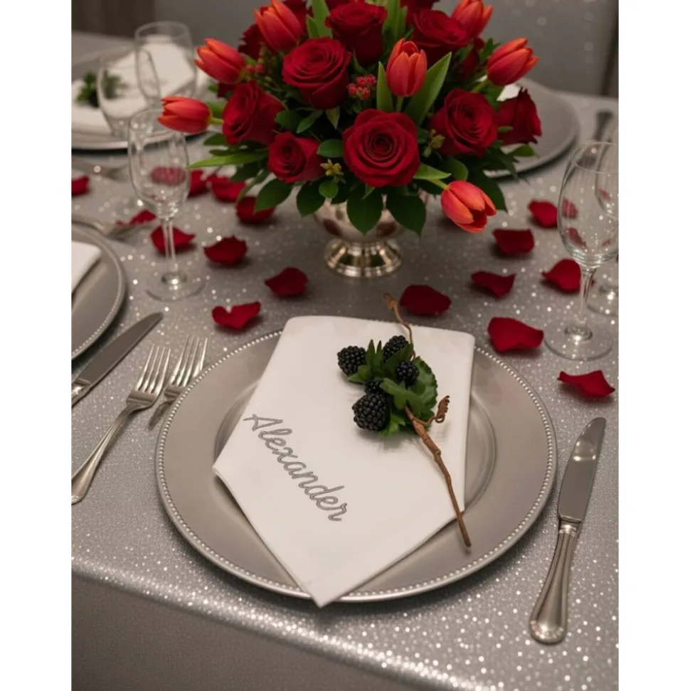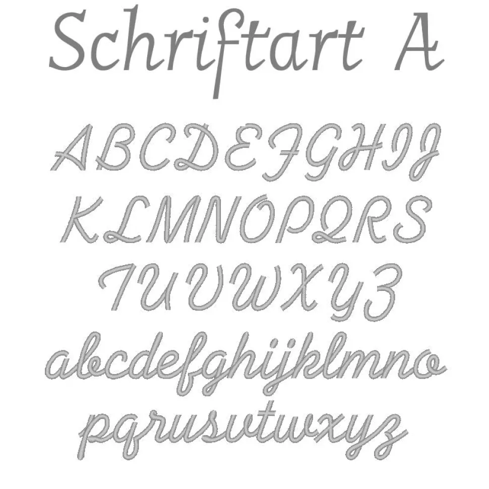 Die Servietten werden mit dem Namen des Gastes in ca. 2 cm Höhe gerade bestickt.