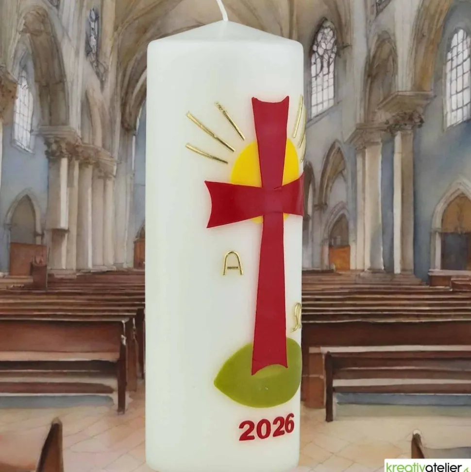 Die festliche christliche Osterkerze mit rotem Kreuz, strahlender Sonne, Alpha und Omega ist ein Kunstwerk, das die Schönheit und Bedeutung des Osterfestes zum Ausdruck bringt. Das rote Kreuz steht für das Leiden und den Tod Jesu, während die strahlende Sonne dessen Auferstehung symbolisiert und die Hoffnung auf ein ewiges Leben verkörpert. Alpha und Omega sind die ersten und letzten Buchstaben des griechischen Alphabets und stehen für den Anfang und das Ende, den Beginn eines neuen Lebens. Diese Kerze ist eine wunderbare Möglichkeit, das Osterfest zu feiern und die Bedeutung dieses wichtigen Ereignisses zu ehren.