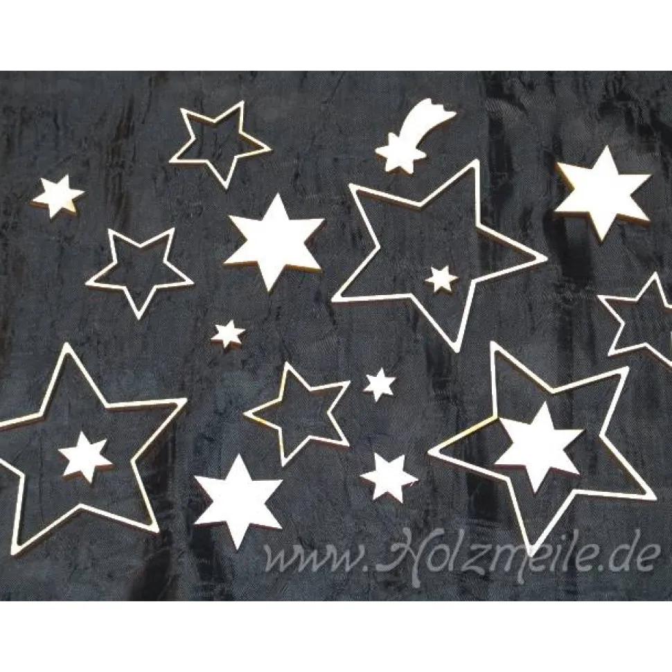 Dieses Set ist ein Mix aus 18 5- und 6-zackigen Sternen von 1cm – 5cm – perfekt für die abwechslungsreiche Gestaltung des Adventskalenders, sehr wirkungsvoll auf dem Adventskranz, tolles Acccessoire für Weihnachtskarten oder Geschenke, auf dem Festtagstisch …Die Teile bestehen aus unbehandeltem Sperrholz, so dass sie problemlos weitergestaltet werden können – von A wie Acrylfarben über S wie Serviettentechnik bis W wie Wachsmalkreiden oder Wasserfarben! Oder doch lieber naturbelassen…?