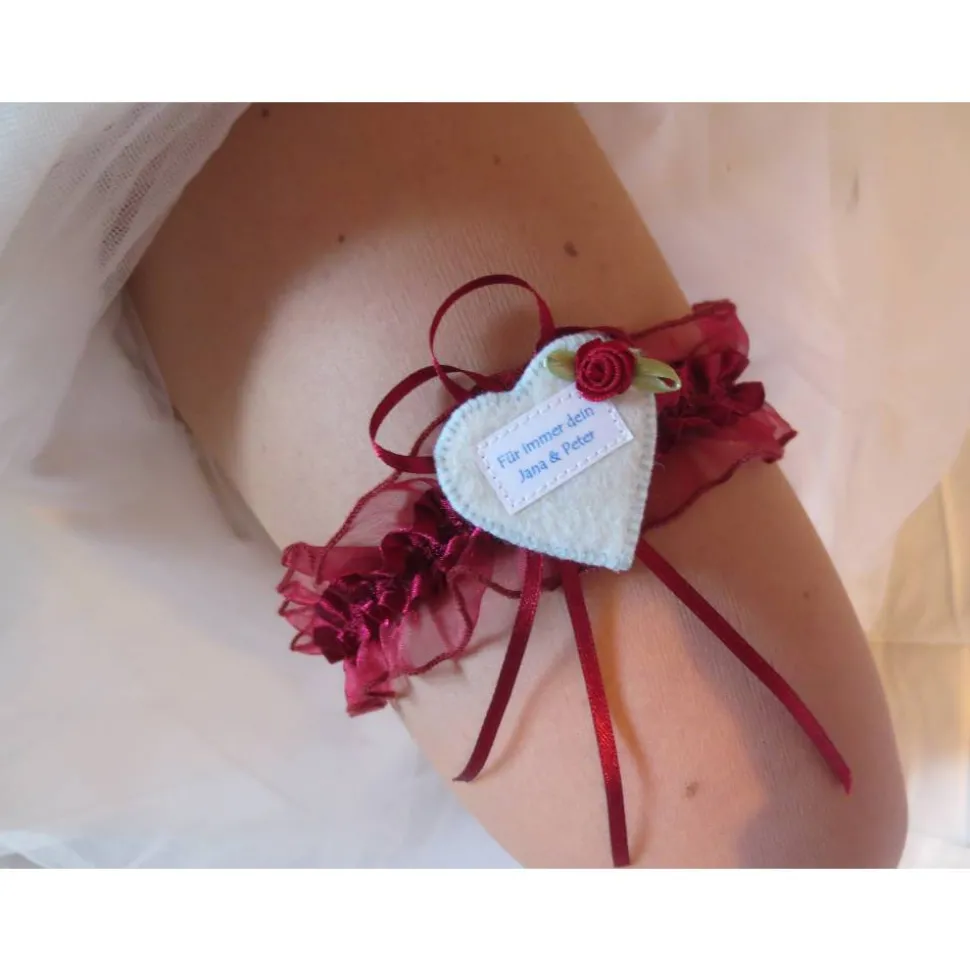 Das weinrote Strumpfband ist aus Satin und Organza in Einheitsgröße passend für einen Beinumfang von ca. 45 cm bis ca. 60 cm genäht.