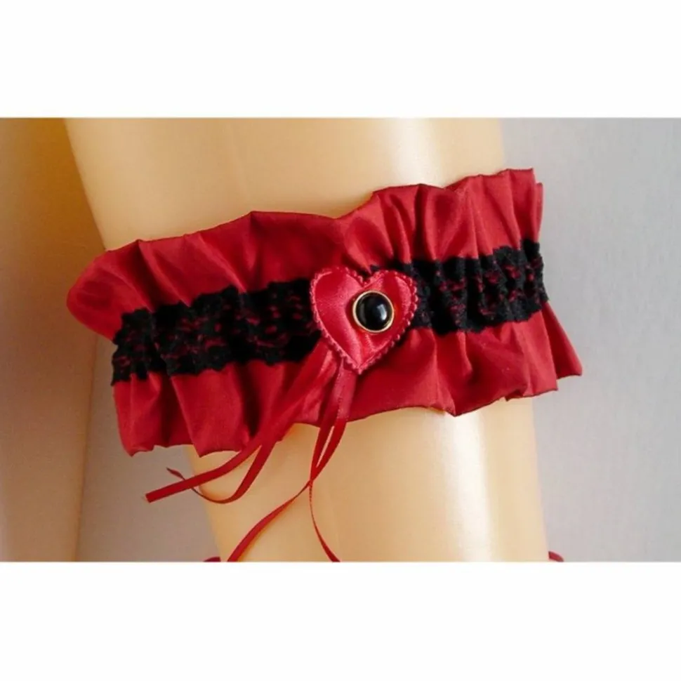 Strumpfband aus roter edler Wildseide, mit schwarzer feiner Vintage-Spitze besetzt toll für eine Gothic-Hochzeit geeignet. In der Mitte ein kleines rotes Herz mit schwarzem Knopf und roten Satinbändern. Hierzu gibt es auch ein passendes Ringkissen. Setpreis für Strumpfband bzw. Halsband und Ringkissen