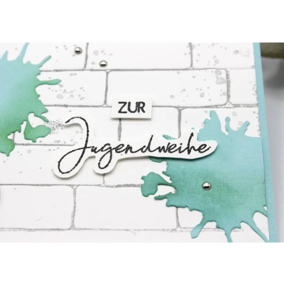Der Hintergrund ist kunstvoll geprägt sowie mit gestempelten Mustern versehen, die eine dezente, aber wirkungsvolle Struktur verleihen.