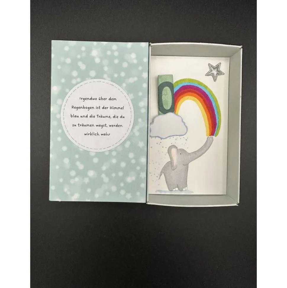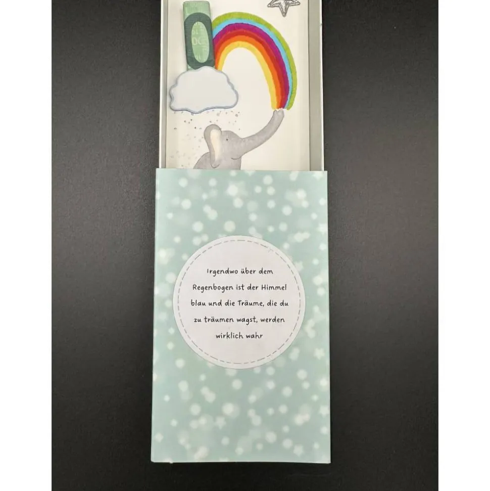 Entdecke die perfekte Geschenkidee zur Taufe oder Geburt: Diese süße Geschenkbox ist liebevoll handgefertigt und begeistert mit einem handgemalten Elefanten, Regenbogen und Regenwolke. Der Geldschein lässt sich einfach oben in die Wolke stecken – so wird das Geldgeschenk auf originelle Weise verpackt. Ein silberner Stern verleiht der Box einen edlen Akzent.