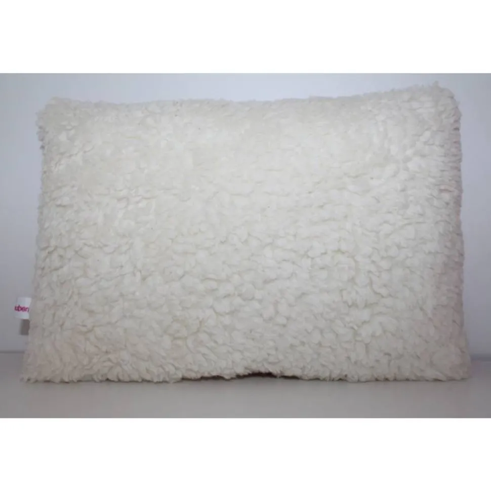 Komplettkissen – Vorderseite 100 % Baumwolle, Rückseite aus Teddystoff Natur 100 % Baumwolle, Füllung 100 % Polyesterwatte/Kügelchen.