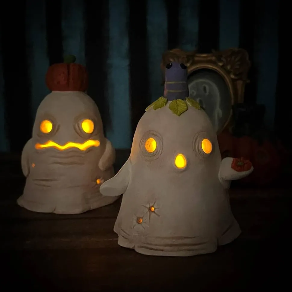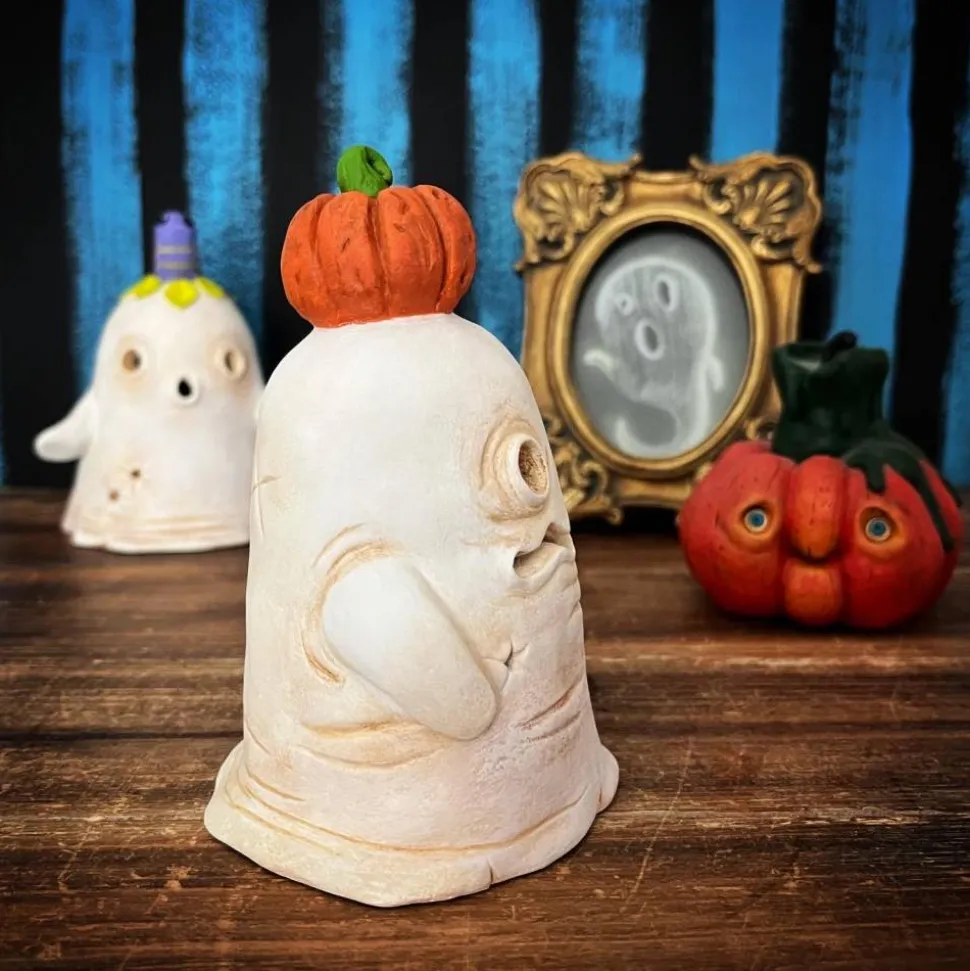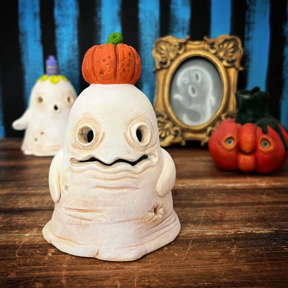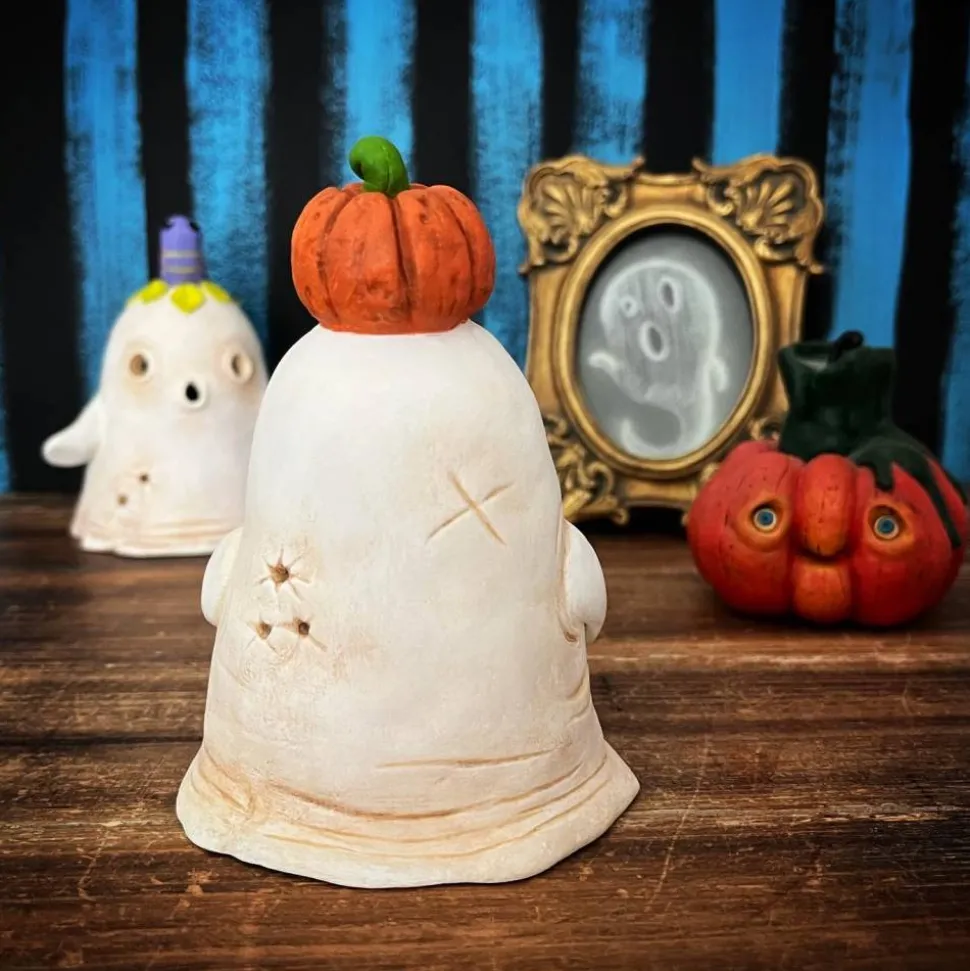 Dieser süße Geist mit Kürbis auf dem Kopf eignet sich perfekt zur Dekoration und das nicht nur zu Halloween.