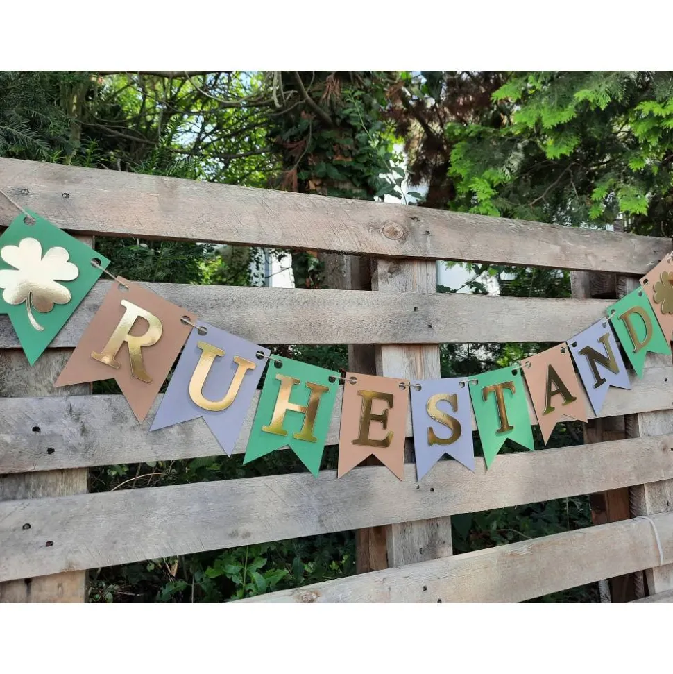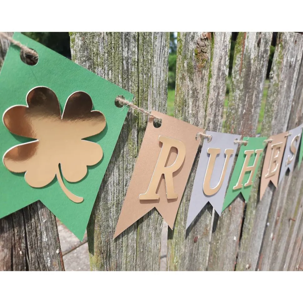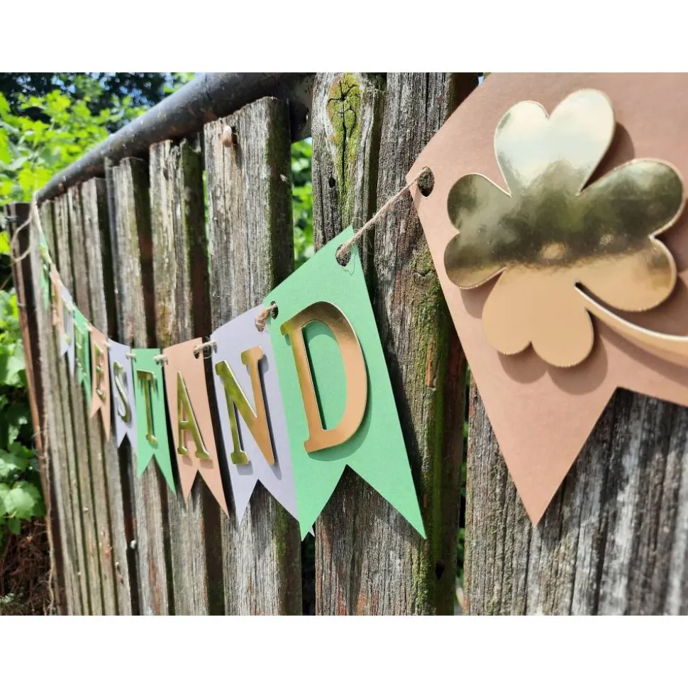 In Grün, Grau und Beige mit spiegelnder goldener Schrift. Am Anfang und Ende ist jeweils ein Wimpel mit Kleebatt als Glückssymbol.