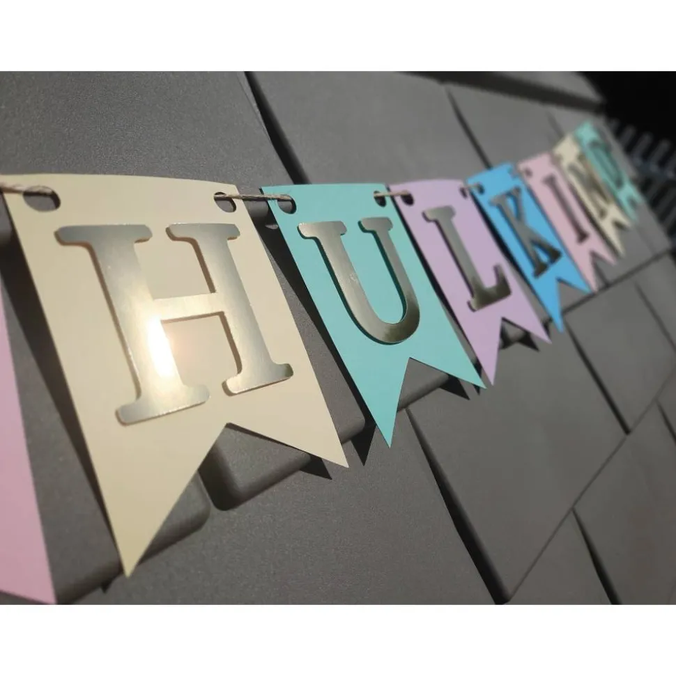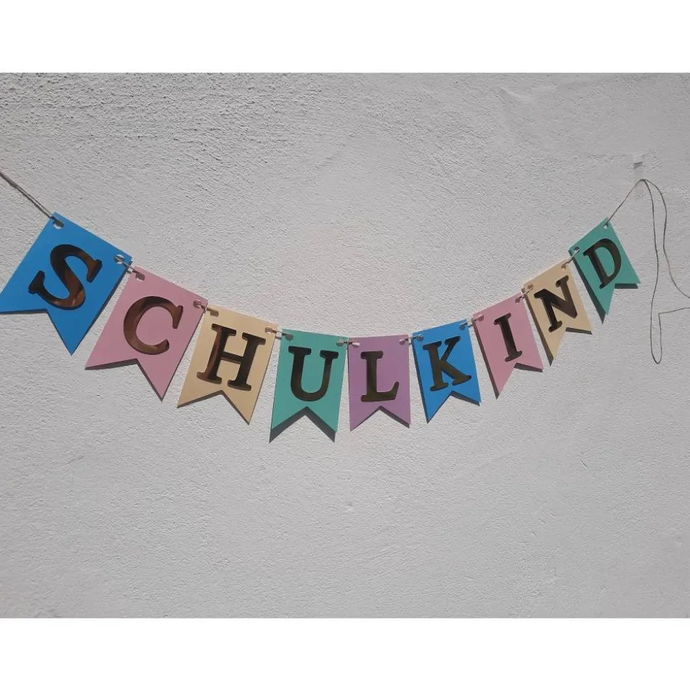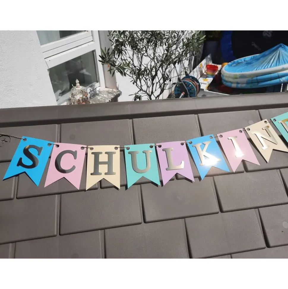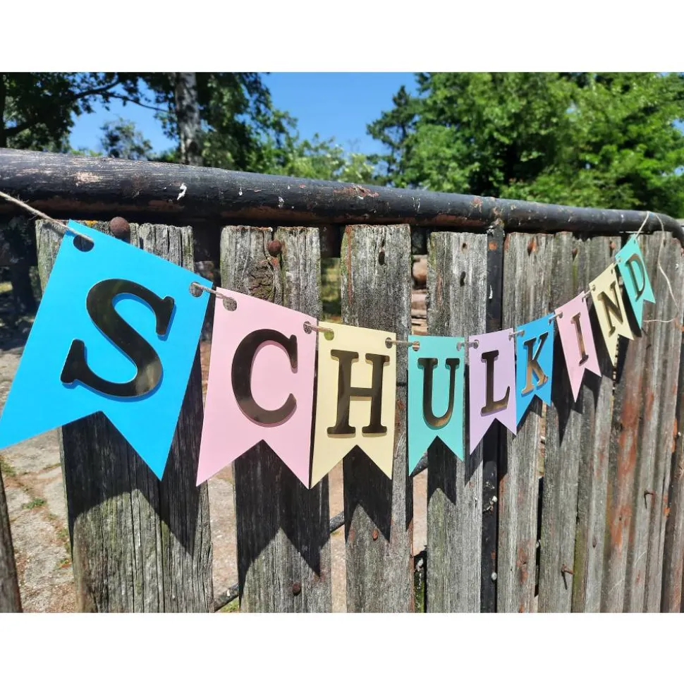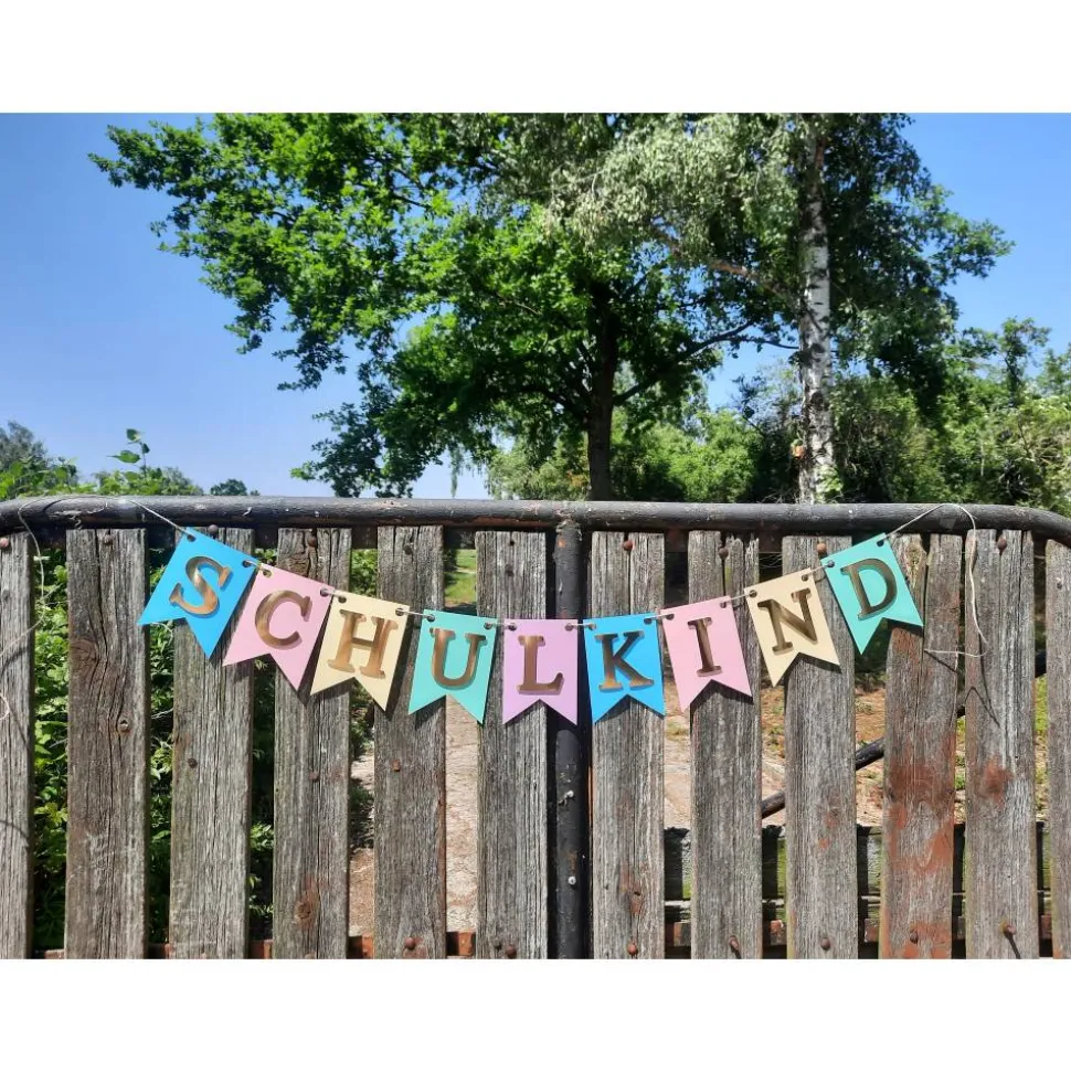 Mit unserer individuell personalisierbaren Girlande zum Schulanfang bekommen Sie die passende Dekoration für diesen spannenden Tag. Die einzelnen Wimpel sind in Pastellfarben gehalten mit Gold spiegelnder Schrift, die durch eine besondere Klebetechnik einen besonderen 3D Effekt bekommt.