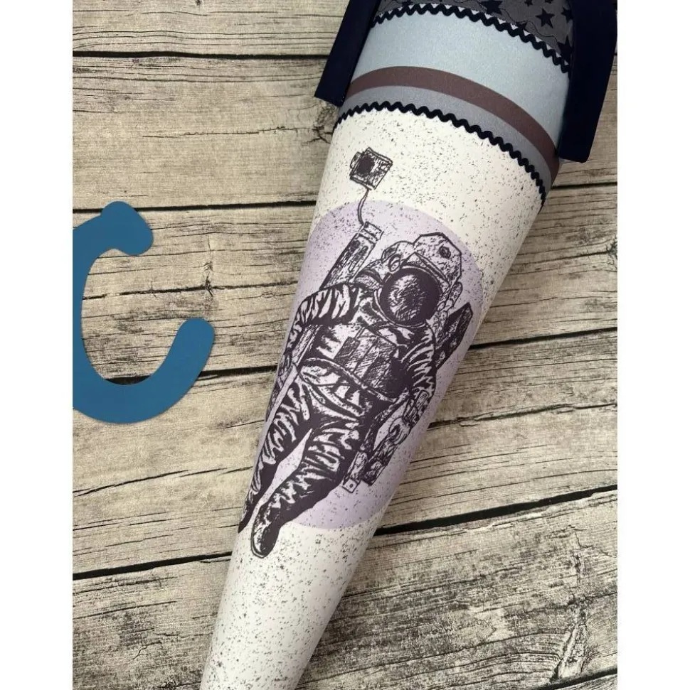 Hier habe ich eine sehr schöne für euch, genäht aus einem tollen Stoffpanel von Stoffwelten mit einem Astronauten-Motiv in Kombi mit dunkelblauer Sternen Baumwolle für den Verschluss. Der Verschluss ist innen mit Tüll verstärkt für einen besseren Stand. Verziert mit schönen Zierbändern.