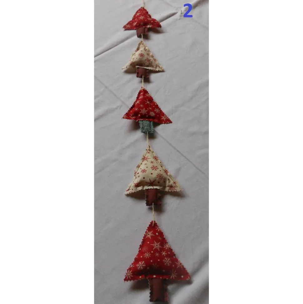 Verleihe deinem Zuhause festlichen Glanz mit dieser einzigartigen Tannenbaumgirlande! Die dekorative Girlande ist die ideale Weihnachtsdeko für Fenster, Tür oder jede Wand. Vertikal reihen sich fünf Tannenbäume übereinander und schaffen so ein stimmungsvolles Ambiente. Jeder Baum ist aus hochwertiger Baumwollwebware gefertigt, während die „Stämme“ aus unterschiedlichen Stoffen wie Leinen, Frottee, Strick und weiteren Materialien bestehen – jede Girlande ist somit ein Unikat.