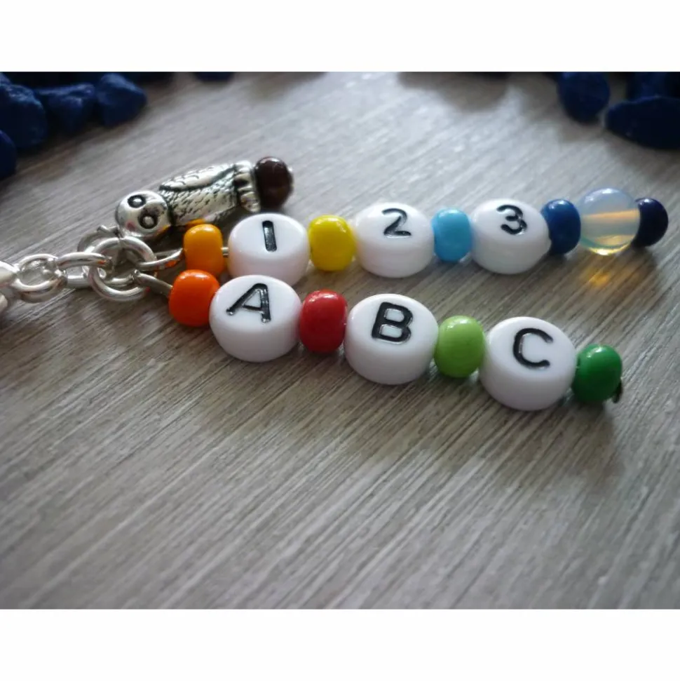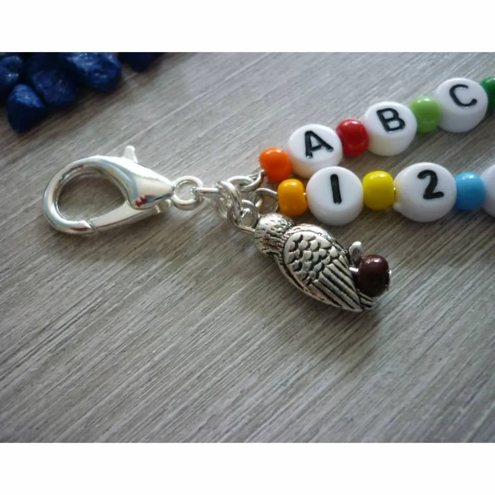 Statt Süßigkeiten zum ersten Schultag schenkst du etwas Persönliches und Praktisches: Der Anhänger kombiniert Buchstaben- und Zahlenperlen (Durchmesser 7mm), bunte Rocailles, eine Mondsteinperle und eine süße Eule. Alles wurde sorgfältig auf Nietstifte aufgereiht und mit Metallösen an einem extra großen Karabiner (21 mm hoch) befestigt.