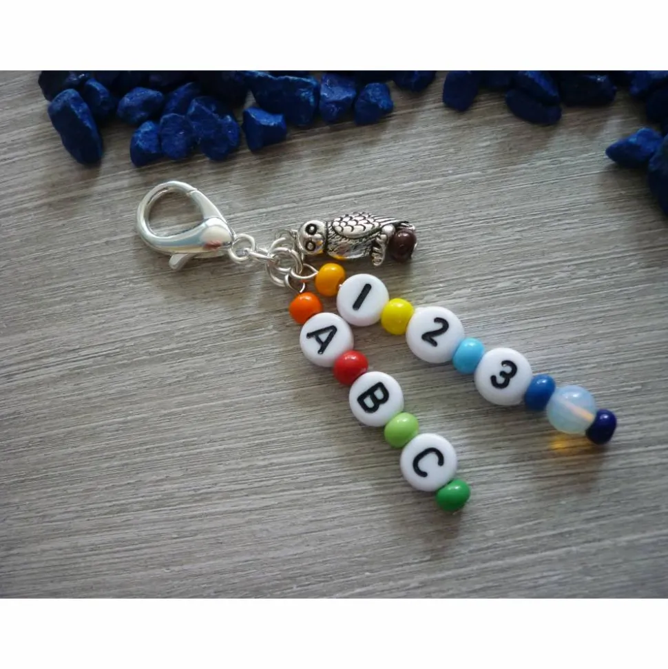Du suchst ein besonderes Geschenk zur Einschulung? Dann ist dieser farbenfrohe Taschenanhänger mit Eule, Mondsteinperle und Buchstaben- sowie Zahlenperlen genau das Richtige!