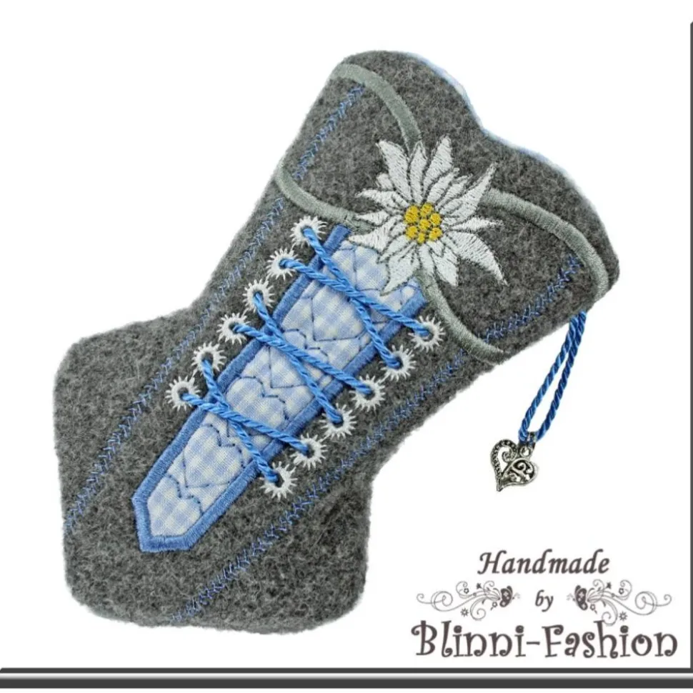Genäht aus graumeliertem Kashmir/Wollstoff, kombiniert mit rot-weißem Vichykaro und bestickt mit einem Edelweiß ist sie genau das Richtige für alle Dirndl-, Trachten- und Oktoberfestfans.