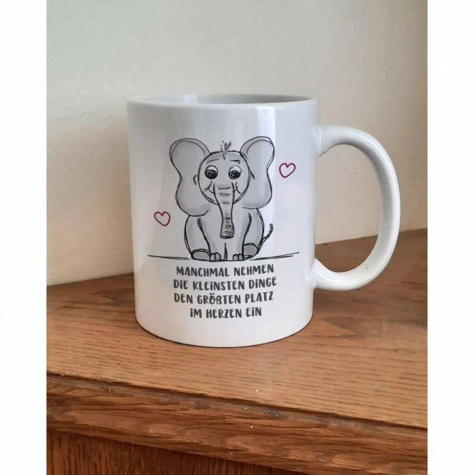 Diese Tasse kommt mit einer niedlichen Babyelefant Zeichnung un einem Spruch der entweder so genommen werden kann, oder gerne personalisiert wird