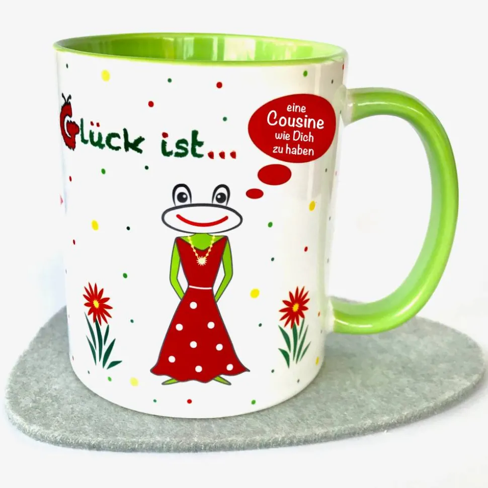 Die fröhlich bedruckte Tasse mit Spruch „Glück ist eine Cousine wie Dich zu haben“ ist das perfekte Geschenk zur Einzugsparty, zum Geburtstag, Weihnachten und vielen anderen Anlässen.
