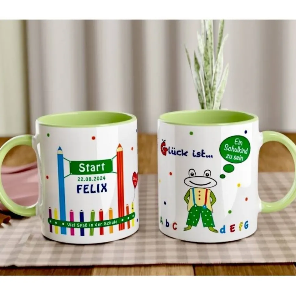 Mit dieser wunderschönen Tasse macht der Schulanfang gleich doppelt Spaß. Mit dem fröhlichen Design, den Buchstaben und dem witzigen Frosch eignet sich diese Tasse zum Schulanfang für Mädchen und Jungen. Gefüllt mit ein paar süßen Leckereien und einen Gutschein für gemeinsame Zeit hast du ein Geschenk zur Einschulung, dass die ABC-Schützen viele Jahre lang auf ihrem Schulweg begleiten wird. Die Tasse kann ganz nach deinen Wünschen individuell personalisiert werden. Wenn du keine Personalisierung möchtest, ist das jedoch auch ohne Weiteres machbar.