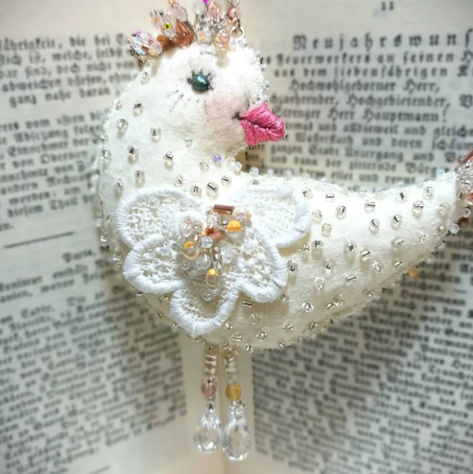 Ein von mir handgemachtes edles Vogelküken elegant und festlich anzuschauen sucht ein neues Heim.Durch das Design in naturweiß creme mit Akzenten von rosegold ist es wunderschön passend zu deinem Landhausstil und shabby chic look. Als hochwertige Dekoration mit Barockperlen in creme und silberverspiegelten Roccailles verziert funkelt es am Fenster, als Hochzeitsdeko oder im Osterstrauss. Komplett von Hand gemacht und in der Ausstrahlung auffälliges sehr aufwändig von mir handbesticktes Vogelornament mit einer Vielzahl Roccailles verschiedener Art aus Glas gemixt mit Akzenten aus schmmernden Barockperlen und Biwaperlen in Nuancen von altweiß werden in dieser Luxus Wohndeko harmonisch in Szene gesetzt.. Das Küken kann am Kettchen auffgehängt werden und die kleine Quaste wie funkelnde Beinchen und die umstickt Kontur bringt zusätzliche Lichtreflexe in den ganzen Raum.