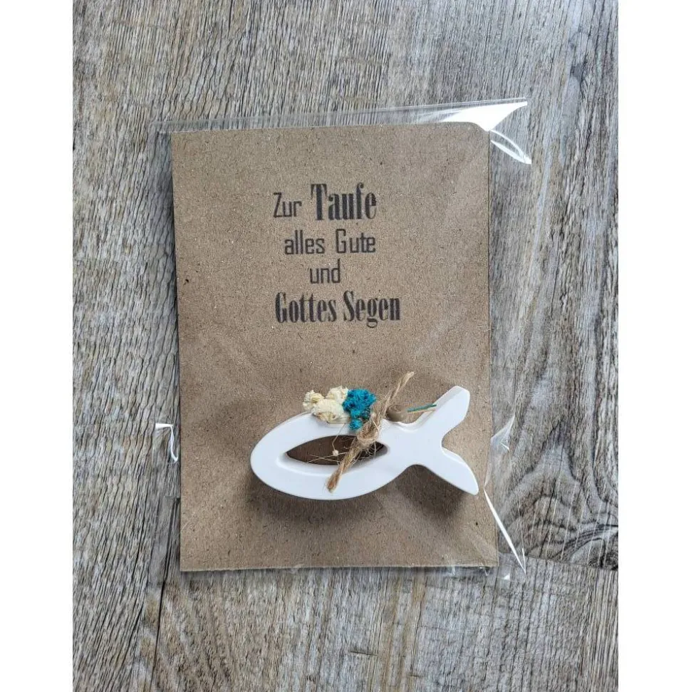 Die Karte ist verziert mit einem aus Keraflott gegossenem Fisch.