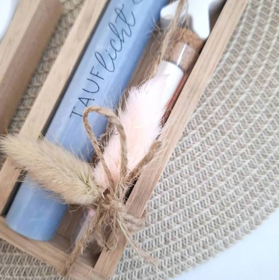 Das Set besteht aus einer Kerze (in der Farbe deiner Wahl) mit einem Taufspruch nach Wahl, einem Reagenzglas und einem symbolischen Fischen in einer Holzbox.