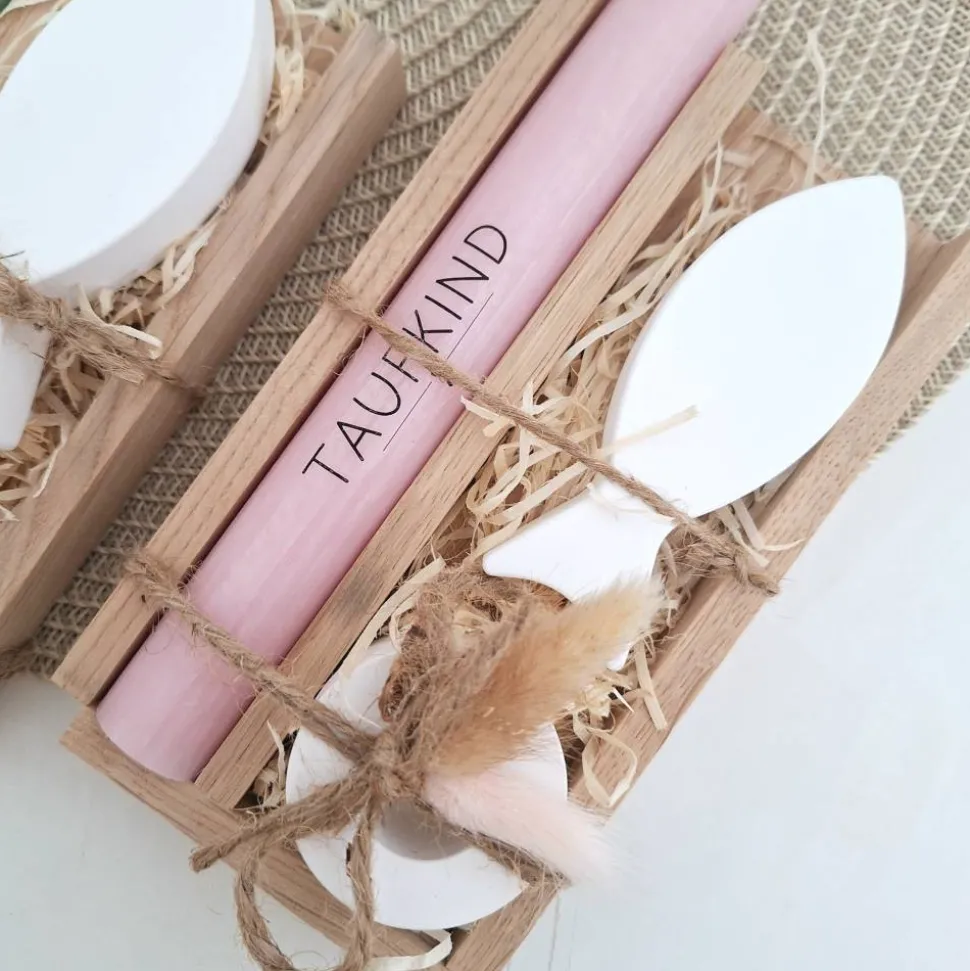 Das Set wird in einem Holzrahmen mit Trockenblumen zusammengebunden und kann so direkt verschenkt werden.