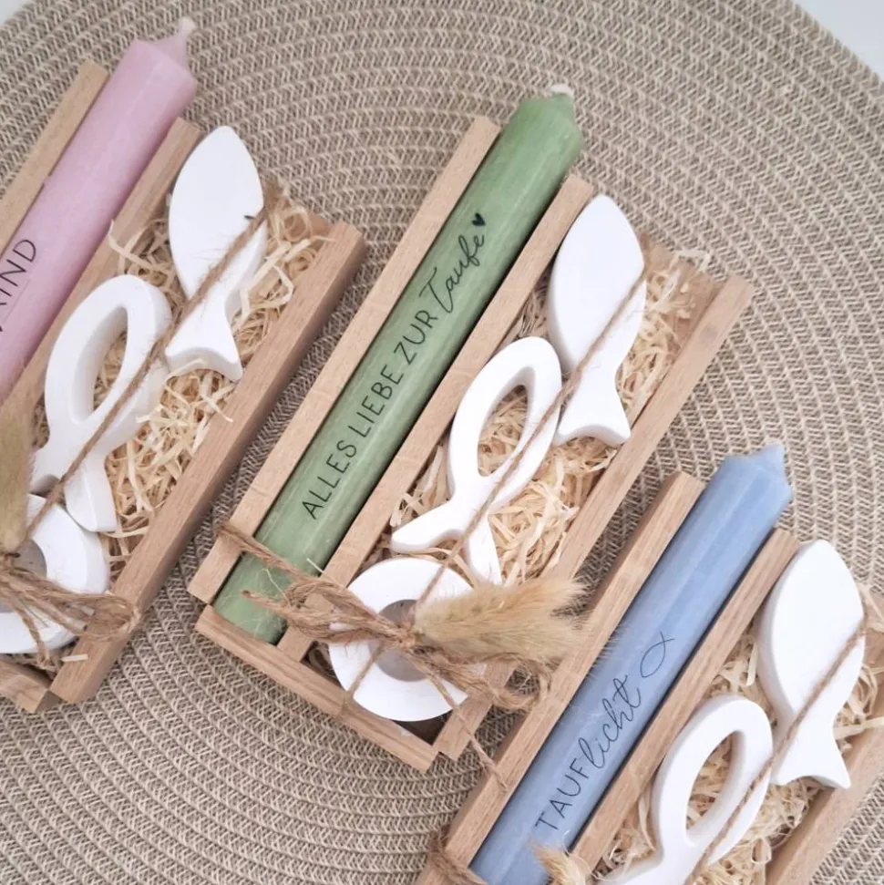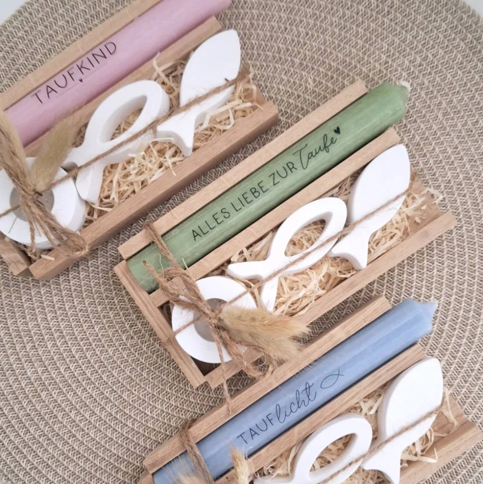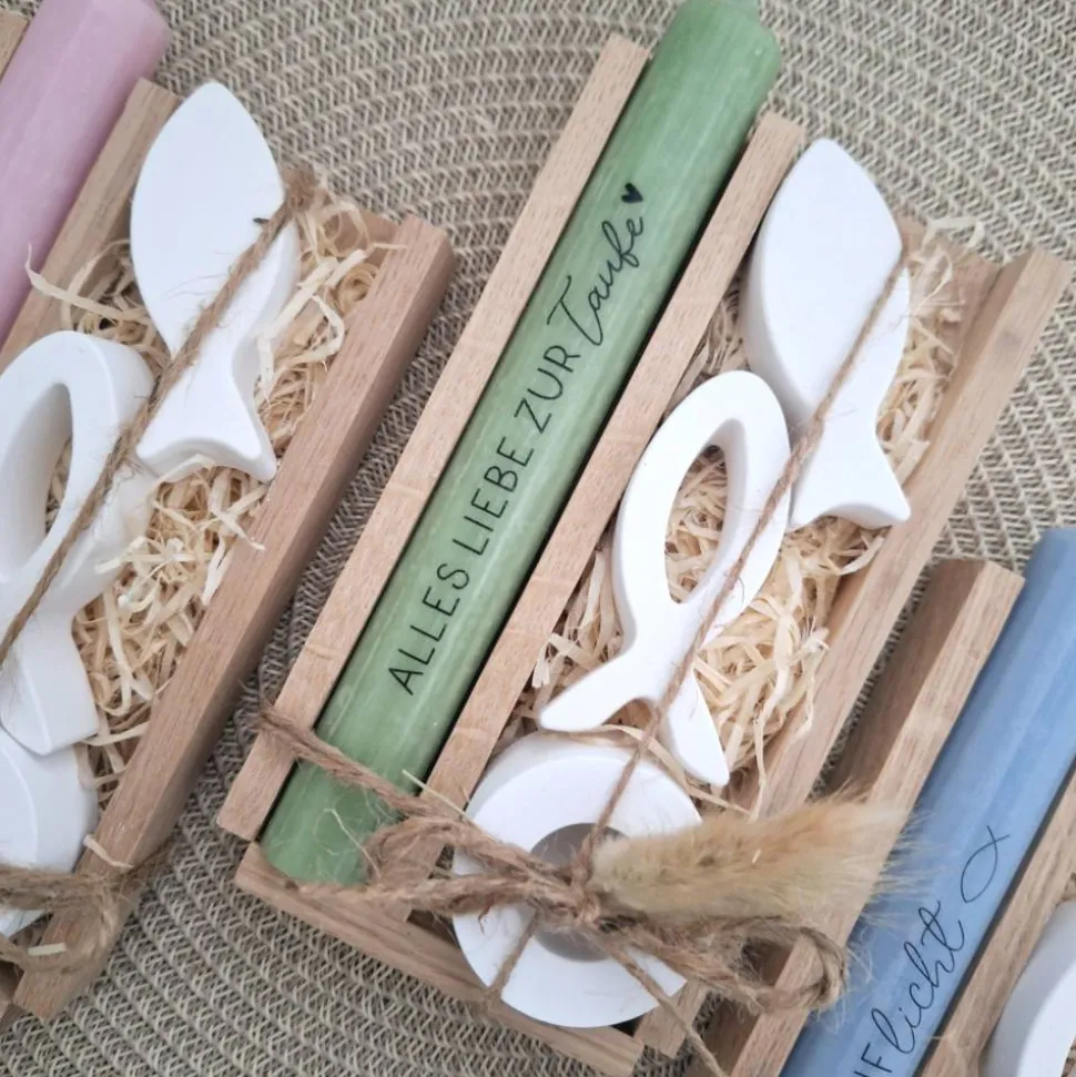 Das Set besteht aus einer Kerze (in der Farbe deiner Wahl) mit einem Taufspruch nach Wahl, einem runden Kerzenhalter und zwei symbolischen Fischen in einer Holzbox.