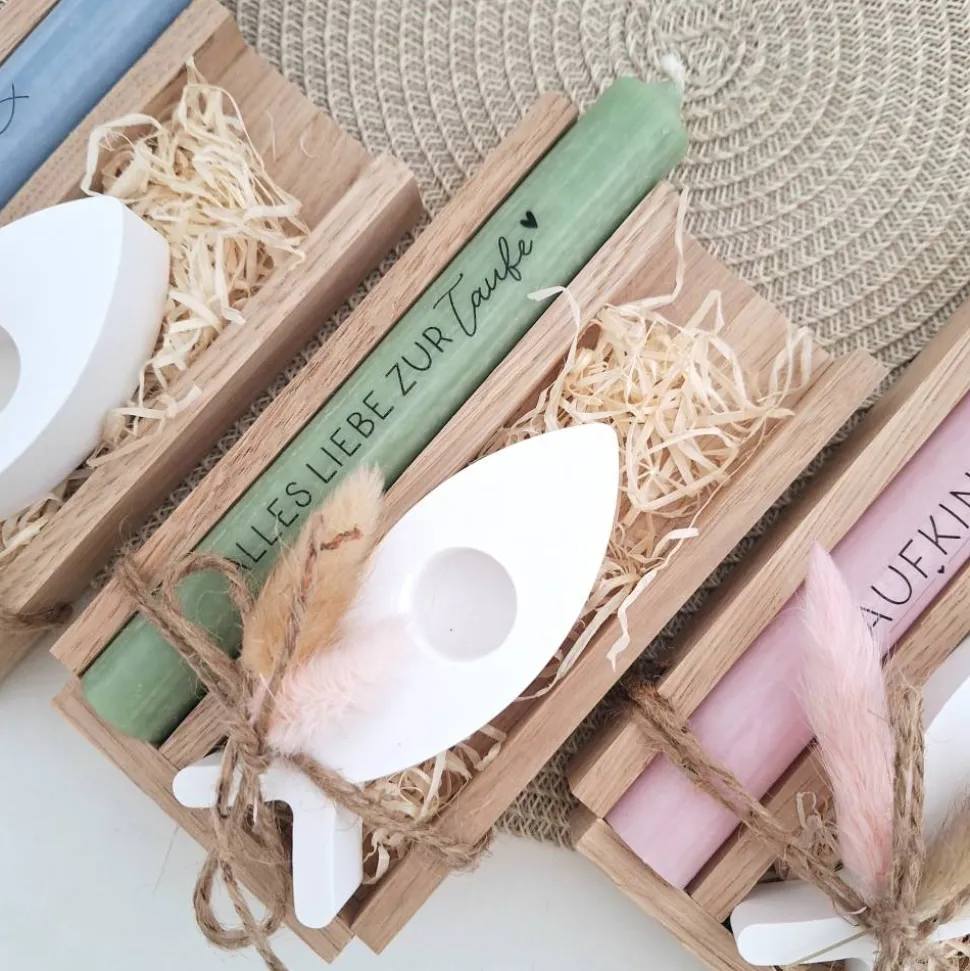 Das Set besteht aus einer Kerze (in der Farbe deiner Wahl) mit einem Taufspruch nach Wahl und einem Kerzenhalter in Fischform