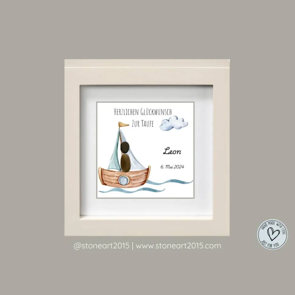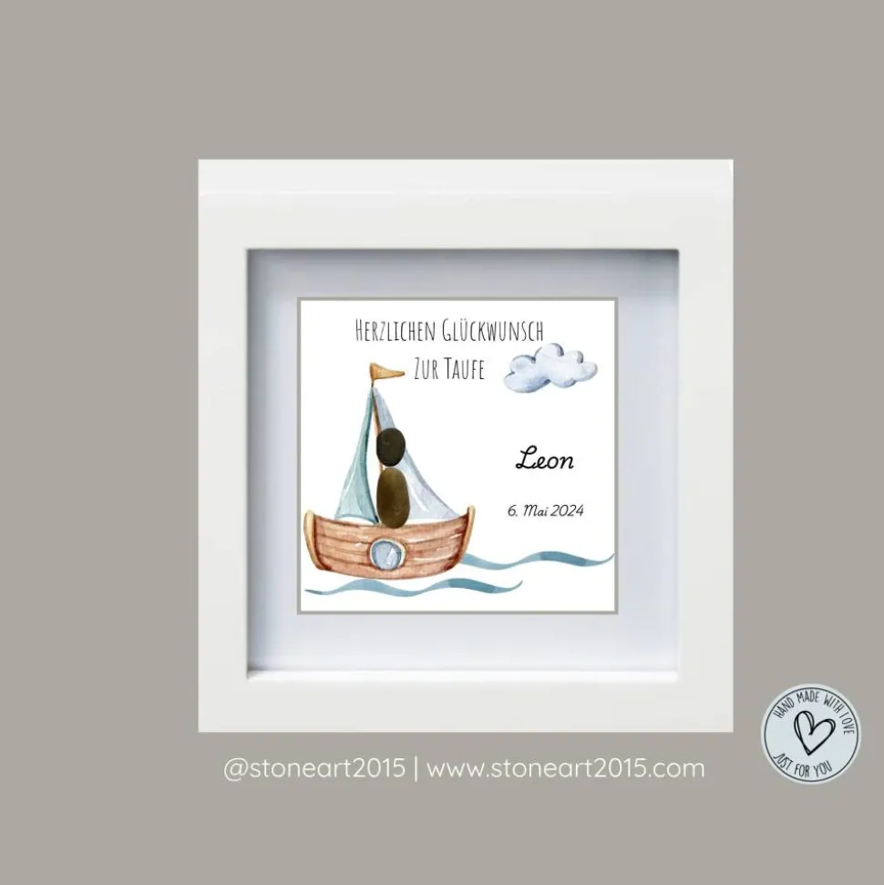 Du suchst ein einzigartiges Taufgeschenk für einen Jungen? Dieses handgefertigte Steinbild mit liebevollem Motiv „Herzlichen Glückwunsch“ und einem kleinen blauen Boot ist ein besonderes Andenken an einen unvergesslichen Tag. Das stilvolle Kunstwerk aus echten Naturmaterialien wird individuell nach deinen Wünschen gefertigt – für ein Geschenk, das Herzen berührt und ein Leben lang bleibt.
