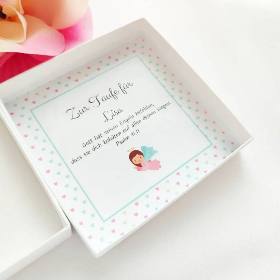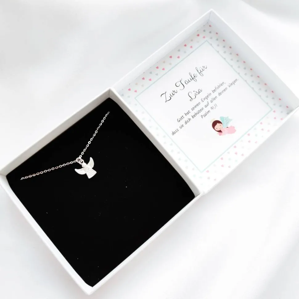 Die Engelkette kommt zauberhaft verpackt in der personalisierten Geschenkbox zur dir. Unglaublich persönlich ist dieses Taufgeschenk für Mädchen und Jungen.