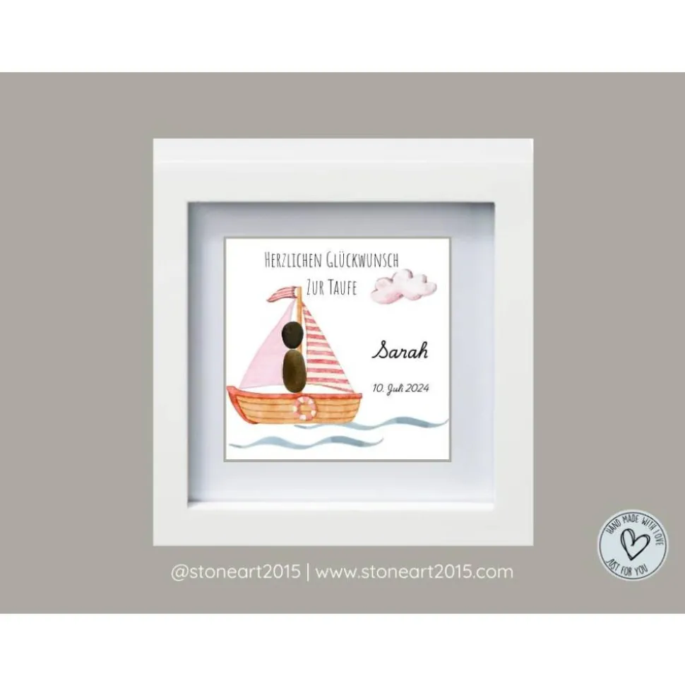 Suchst du ein einzigartiges Taufgeschenk für ein Mädchen? Dieses handgefertigte Steinbild ist ein ganz besonderes Andenken an die Taufe. Mit dem liebevollen Motiv „Herzlichen Glückwunsch“ und einem kleinen rosa Boot schenkst du ein Unikat, das ein Leben lang bleibt.