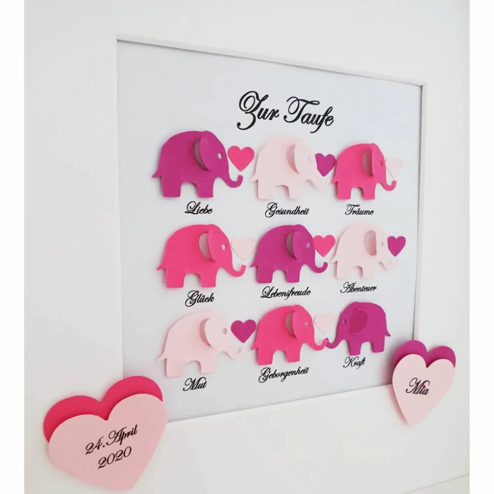 Unter den kleinen Elefanten rechts und links können Sie den individuellen Namen sowie das individuelle Geburtsdatum oder Taufdatum bestimmen.