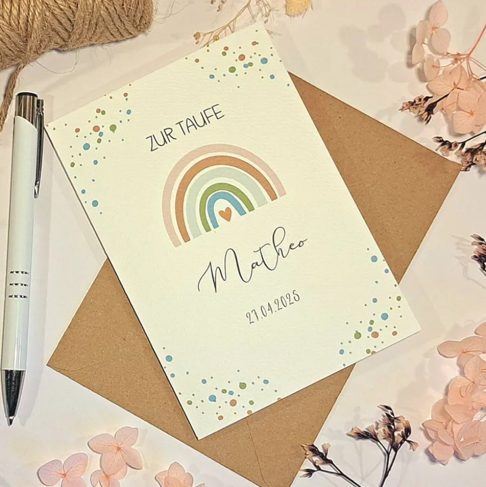 Du erhältst die Karte inklusive passendem Umschlag aus Kraftpapier. Sie eignet sich perfekt als Geschenk zur Taufe von Jungen und kann mit anderen Taufgeschenken kombiniert werden.