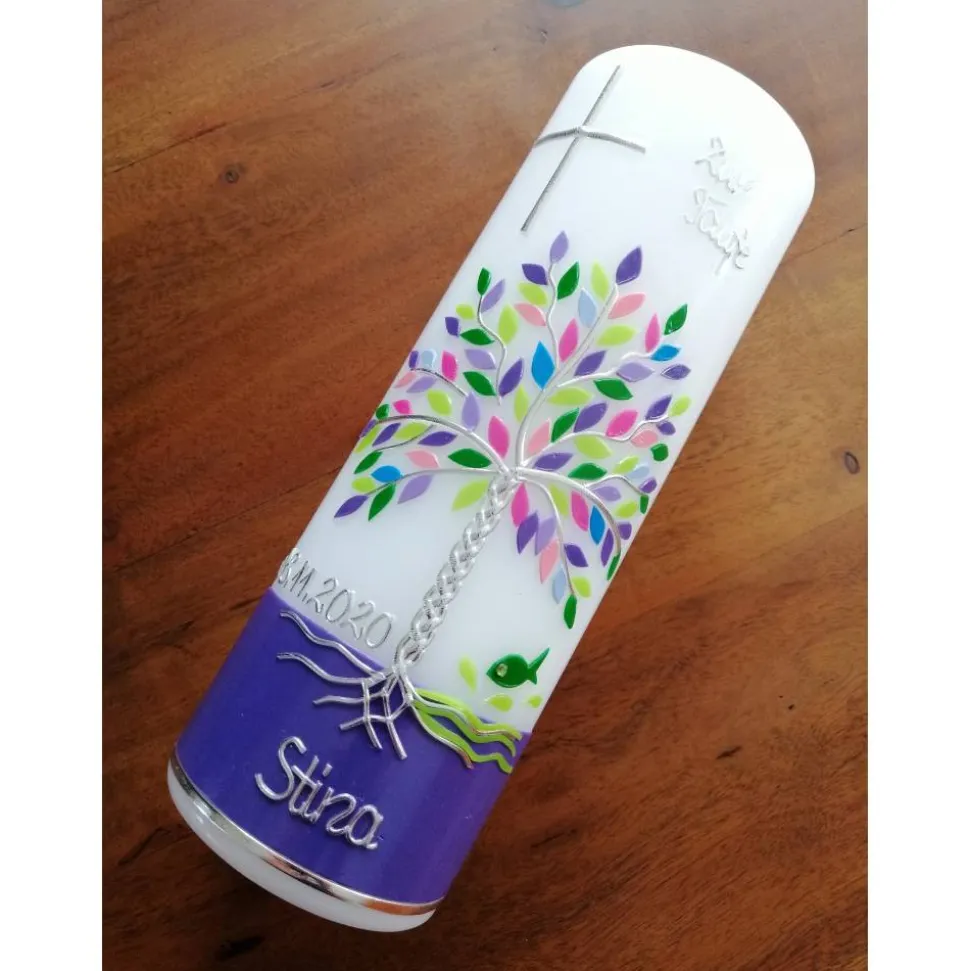 Taufkerze Lebensbaum mit hochwertigen Wachsverzierungen und Beschriftung aus Buchstabenperlen