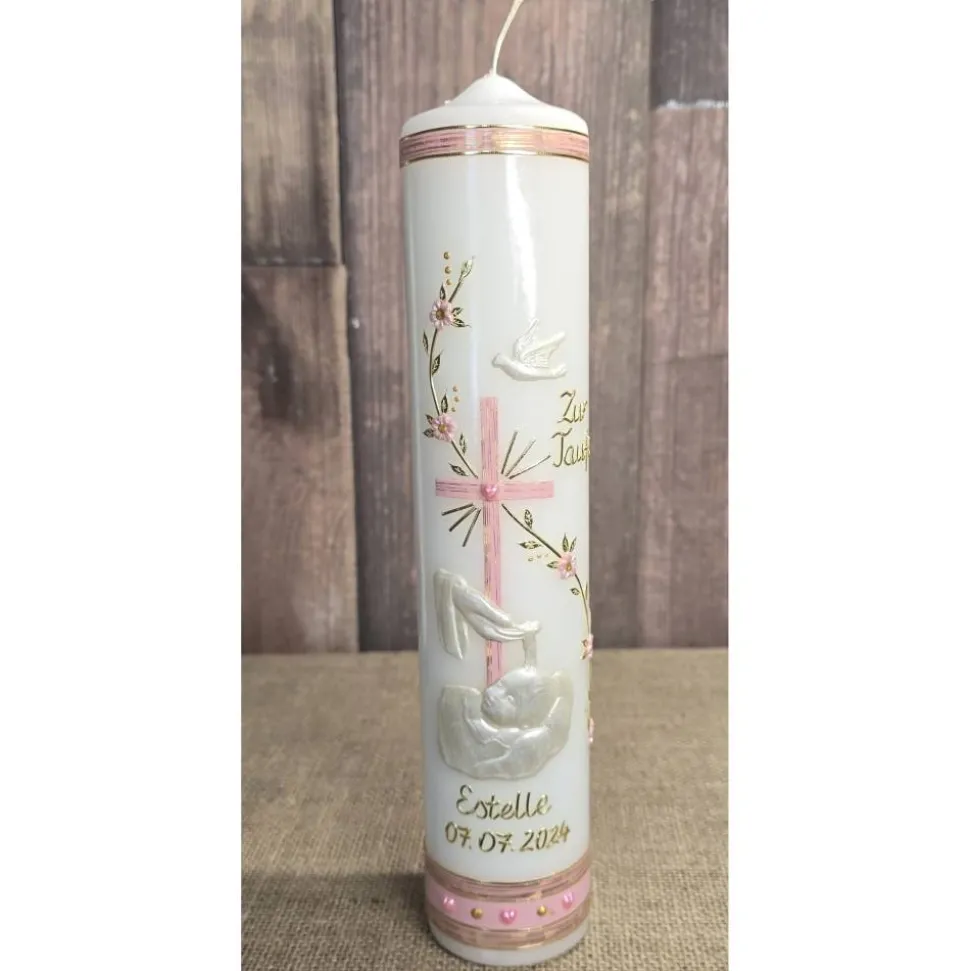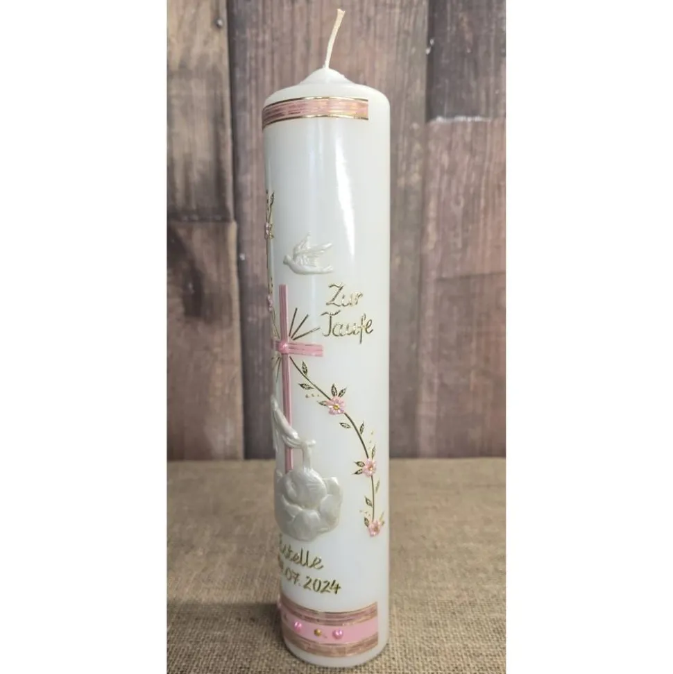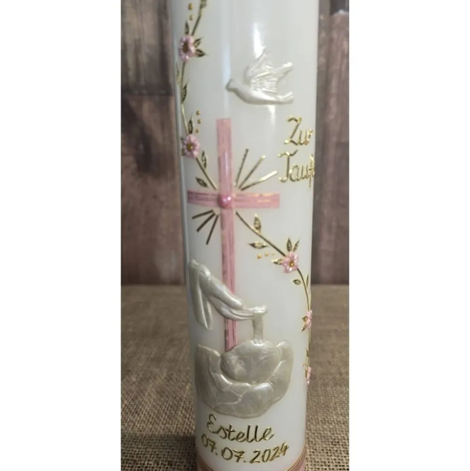 Bitte bei der Bestellung unbedingt angeben ob die Kerze mit oder ohne den Schriftzug: „Zur Taufe“ gefertigt werden soll.