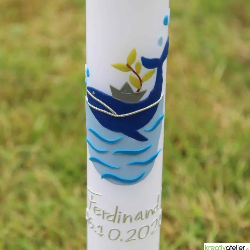 Diese weiße Taufkerze ist ein besonderes Kunstwerk, das eine einzigartige Geschichte erzählt. Der blaue Walfisch symbolisiert Kraft, Hofffnung, Stärke, Größe und Abenteuerlust. Außerdem ist das Motiv an die beliebte Bibelgeschichte „Jona und der Wal“ angelehnt. Das Meer und das Schiffchen, stehen für die unendlichen Möglichkeiten und das Abenteuer, das das Kind im Leben erwartet. Es trägt ihn durch die Stürme des Lebens und gibt ihm Halt und Sicherheit.