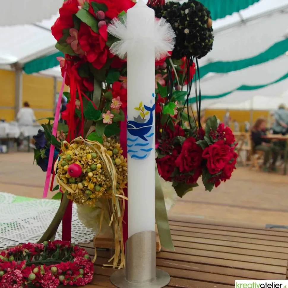 Die Taufkerze kann mit Namen und Datum unterhalb des Meeres personalisiert werden. Diese Taufkerze wird in meinem Atelier individuell in Handarbeit für Sie gefertigt. Die Taufkerze eignet sich sehr gut zur weiteren Verwendung als Kommunionkerze. Als Rohling verwende ich ausschließlich Qualitätskerzen, die in Deutschland nach traditionellen Verfahren gezogen werden.