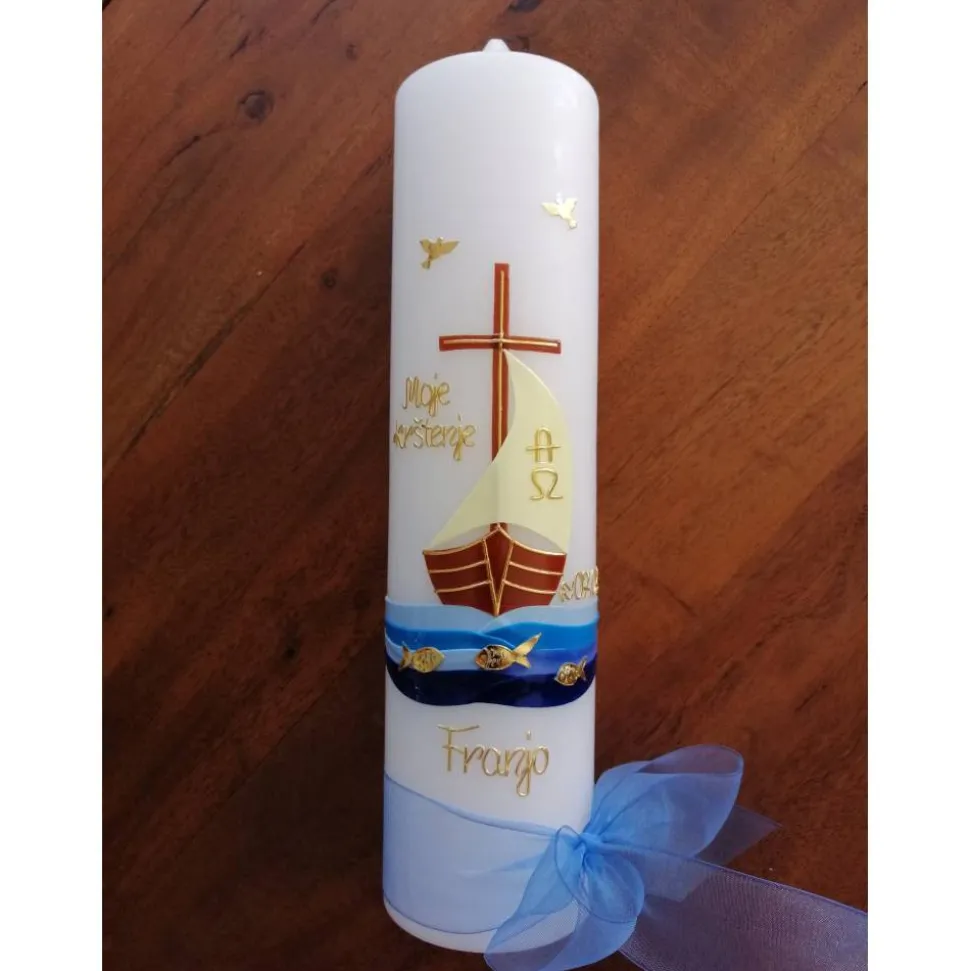 Taufkerze Boot – Arche – mit hochwertigen Wachsverzierungen