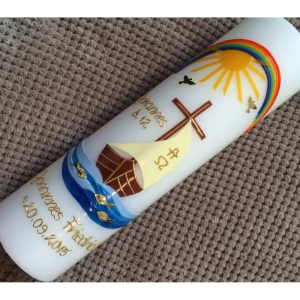 Taufkerze Boot – Arche – mit hochwertigen Wachsverzierungen