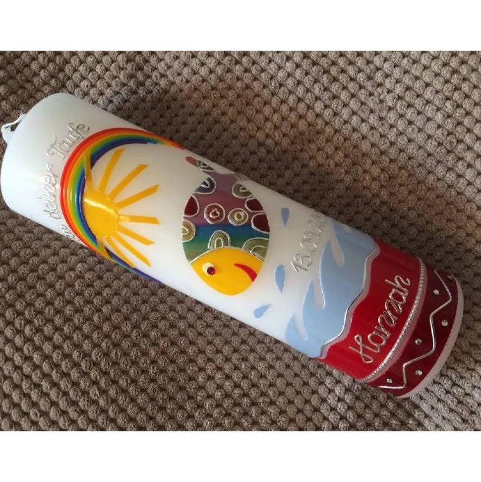 Taufkerze bunter Fisch mit hochwertigen Wachsverzierungen