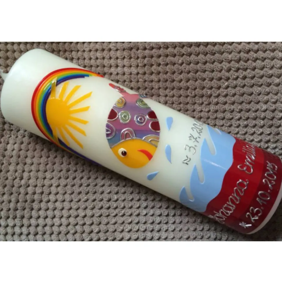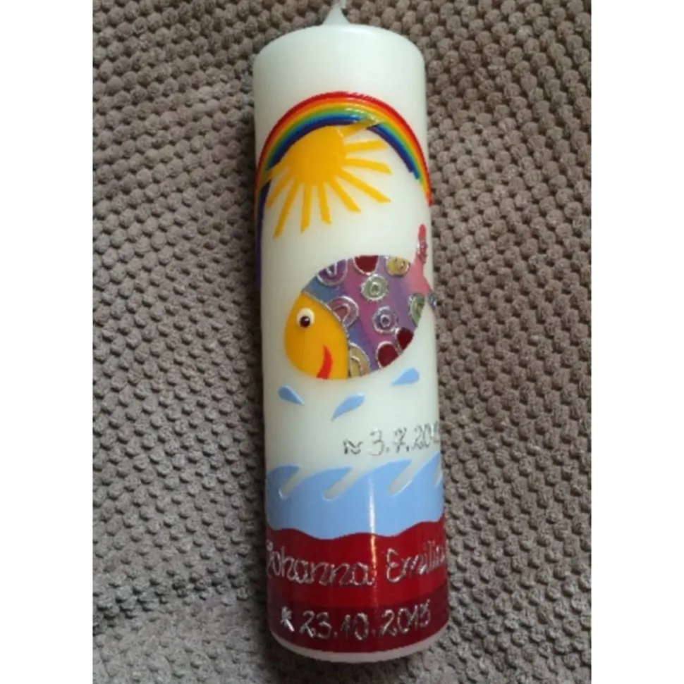 Taufkerze bunter Fisch mit hochwertigen Wachsverzierungen