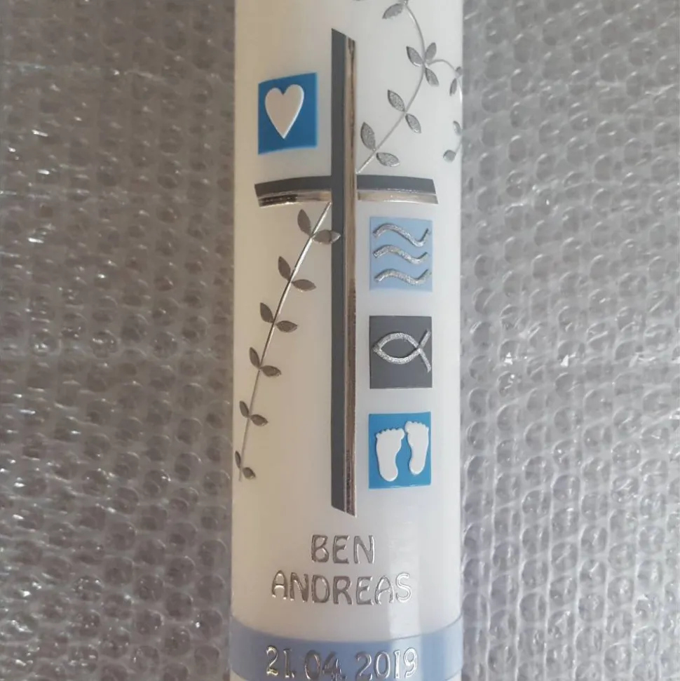 Die Taufkerze ist in verschiedenen Größen erhältlich. Auf dem Bild ist sie in der Größe 30 x 5 cm zu sehen.