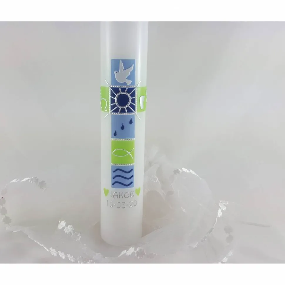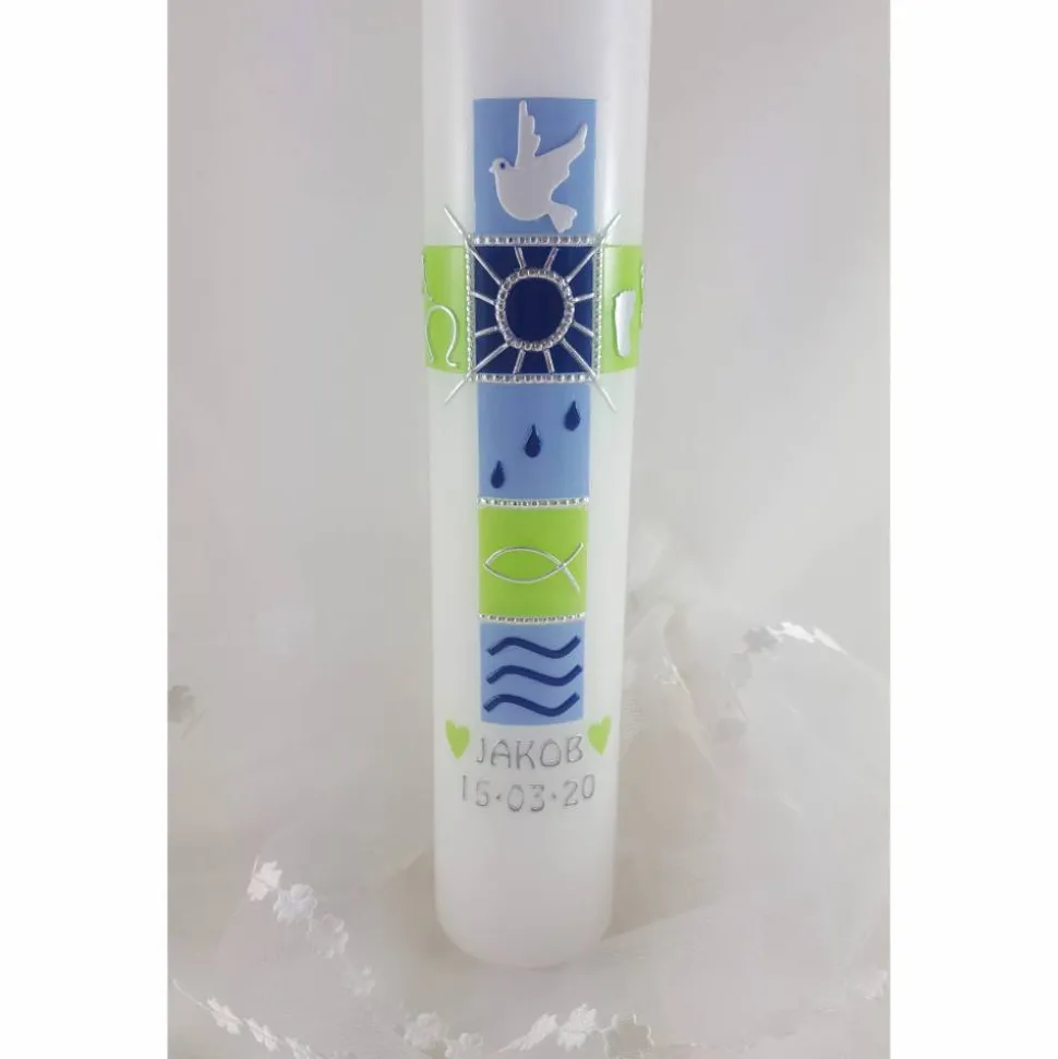 Das Motiv dieser Taufkerze wird aus Wachs gefertigt, Name und Datum werden mit Konturenstickern aufgebracht.