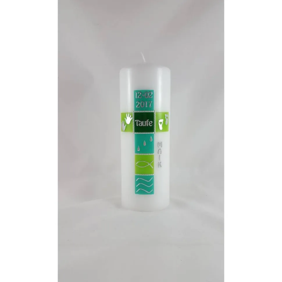 In den einzelnen grünen Kästchen auf der Taufkerze finden sich folgende Symbole: Wellen, Fisch, Wassertropfen, Füßchen und Händchen. Außerdem wird der Name und das Datum mit Konturenstickern aufgebracht. Die einzelnen Symbole können gerne auf Wunsch geändert werden (z. Bsp. wenn Sie dieses Motiv auf einer Kommunionkerze haben wollen oder das Kind schon älter ist und Händchen und Füßchen nicht mehr angebracht sind.