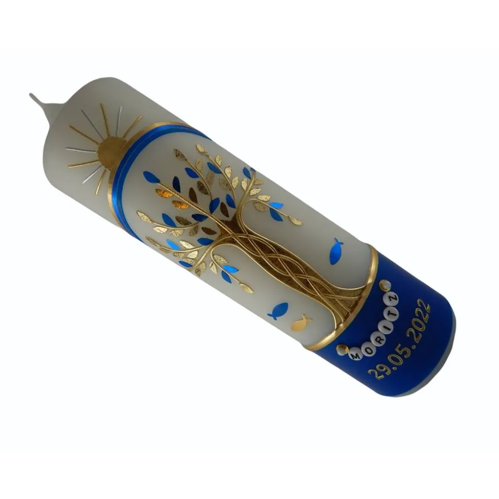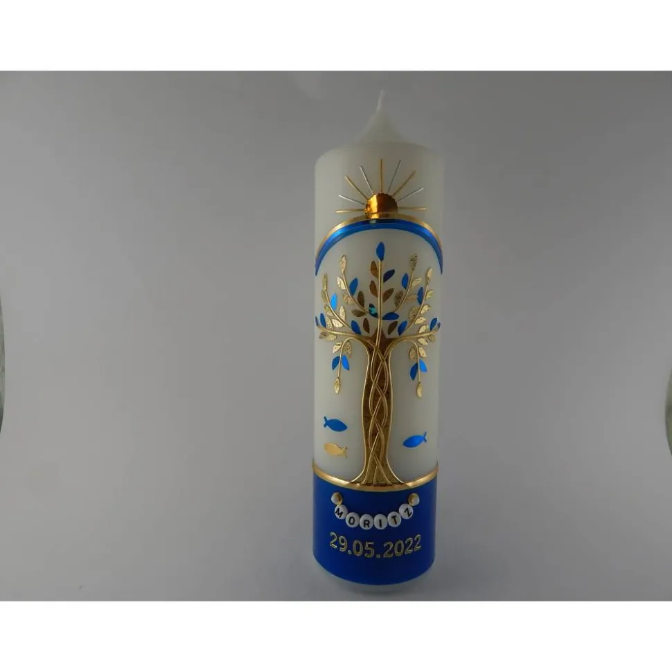 Taufkerze Jungen Lebensbaum blau gold Baum des Lebens Regenbogen Fische Sonne Name Datum Spruch individualisierbar