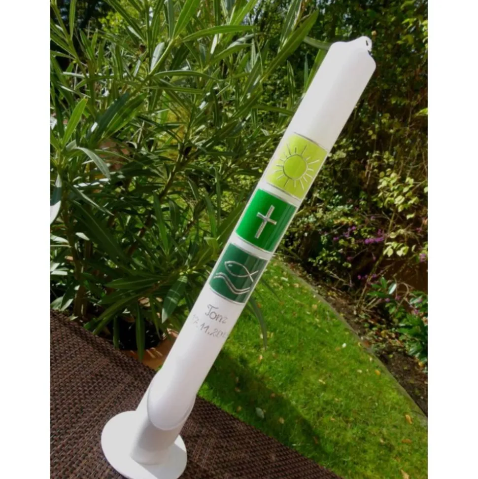 Die Taufkerze/Kommunionkerze kann Ihren Wünschen entsprechend beschriftet werden.