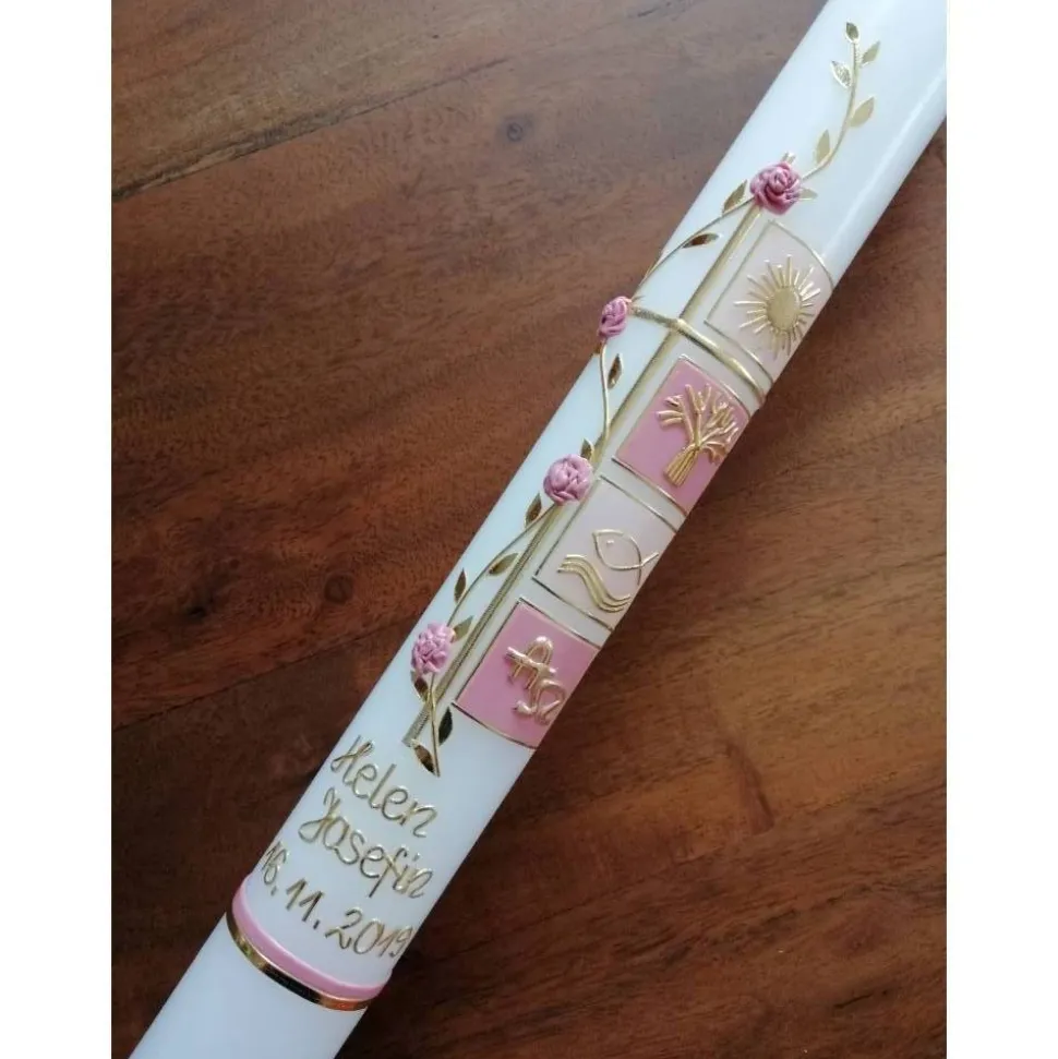 Die Verzierung auf der Kerze wird in liebevoller Handarbeit für Sie erstellt.