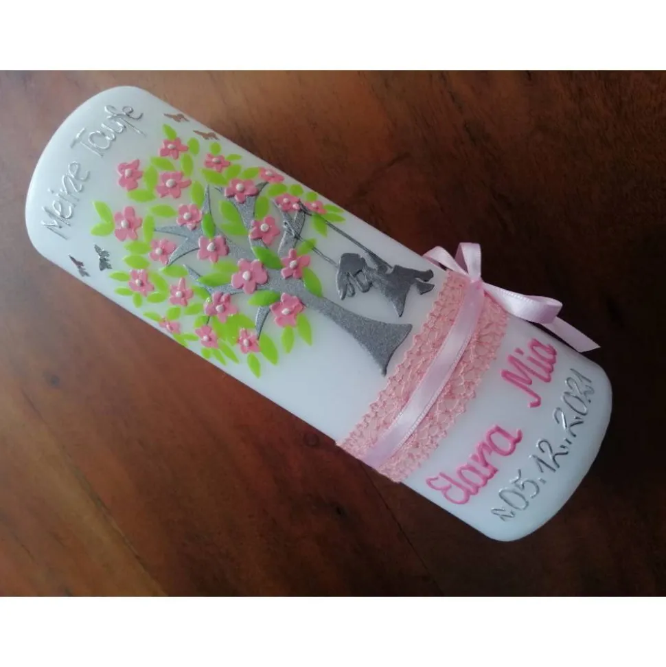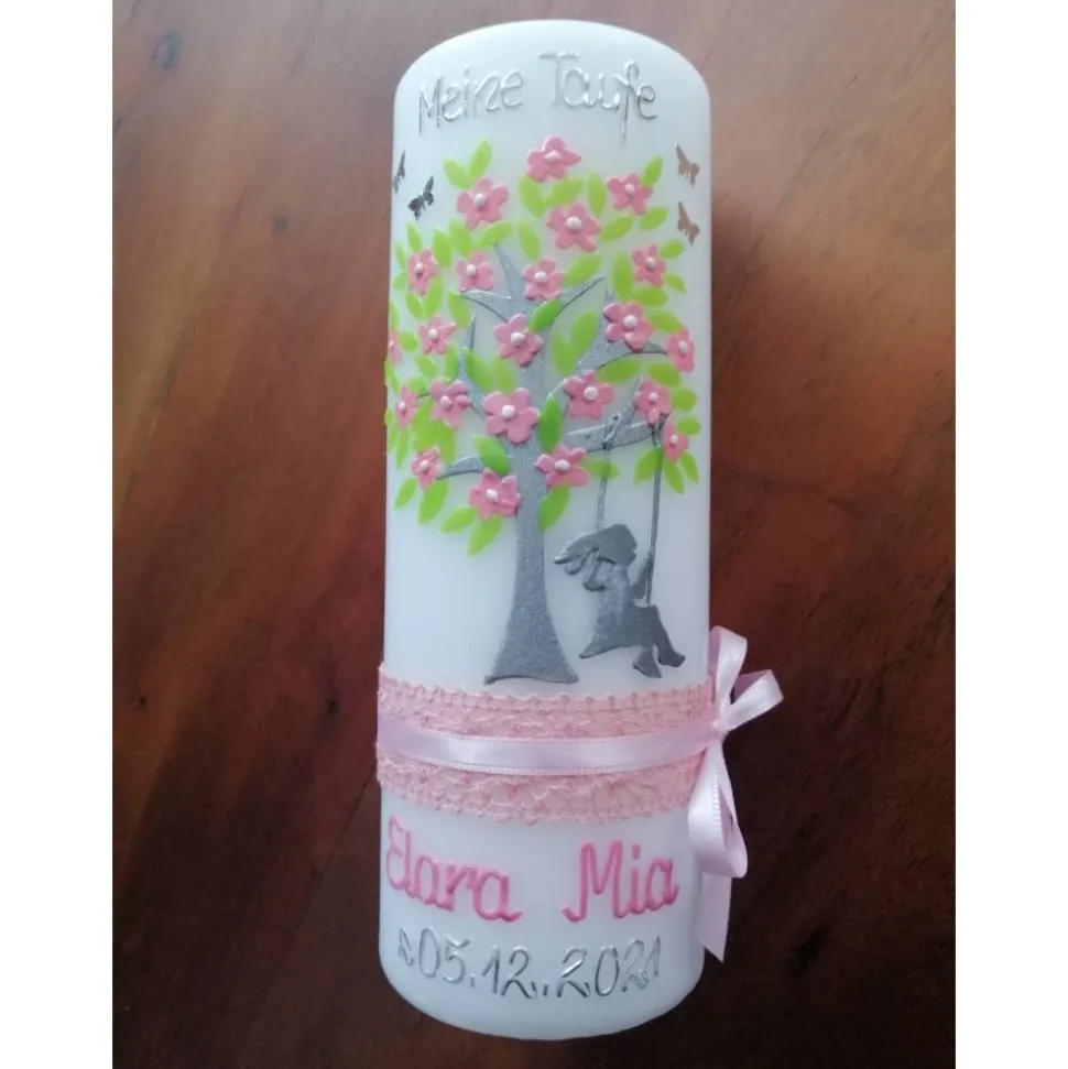 Taufkerze oder Kommunionskerze Lebensbaum Baum Schaukel mit hochwertigen Wachsverzierungen