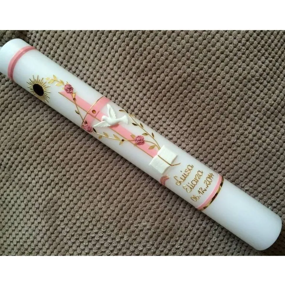 Die Taufkerze / Kommunionkerze hat die Größe 40 x 5 cm.